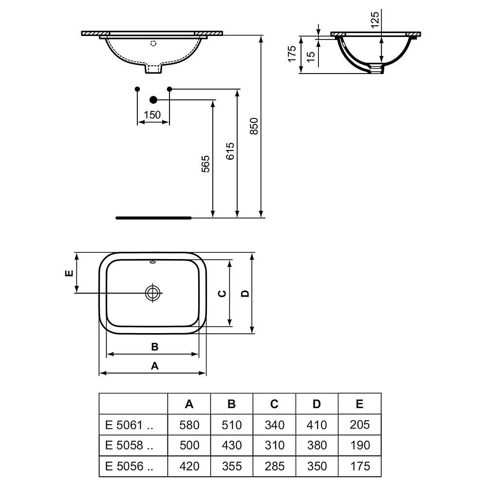 Ideal Standard Connect Unterbauwaschtisch 58 cm, ohne Hahnloch, mit Überlauf