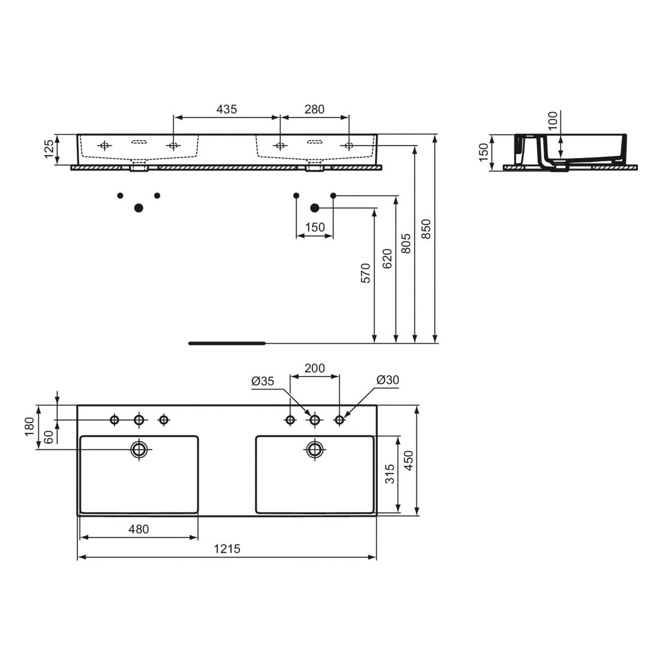 Ideal Standard Extra Doppel-Waschtisch 121,5 cm, je 3 Hahnlöcher mit Überlauf