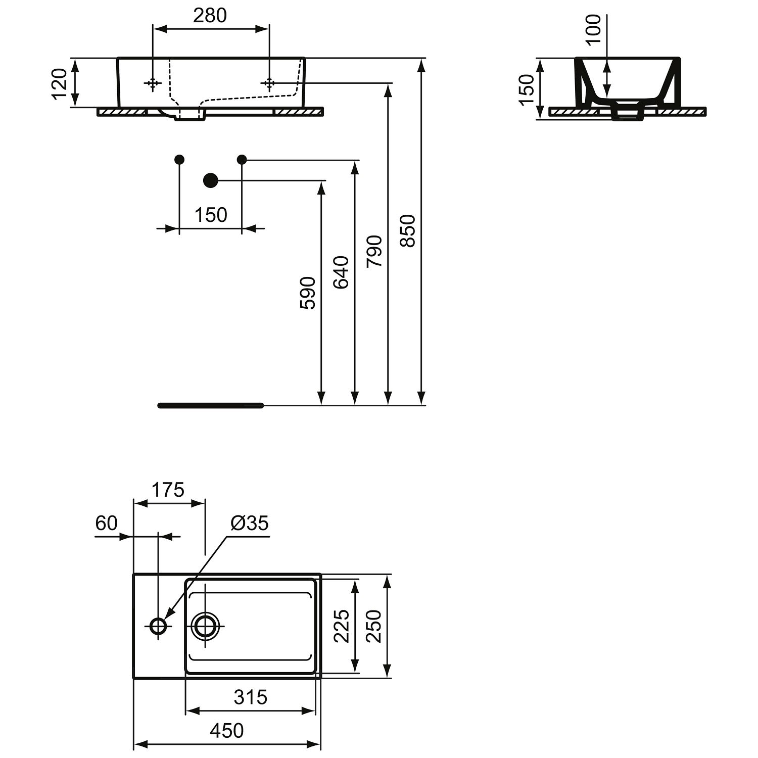 Ideal Standard Extra Handwaschbecken 45 cm, Hahnbank links, 1 Hahnloch, mit Überlauf