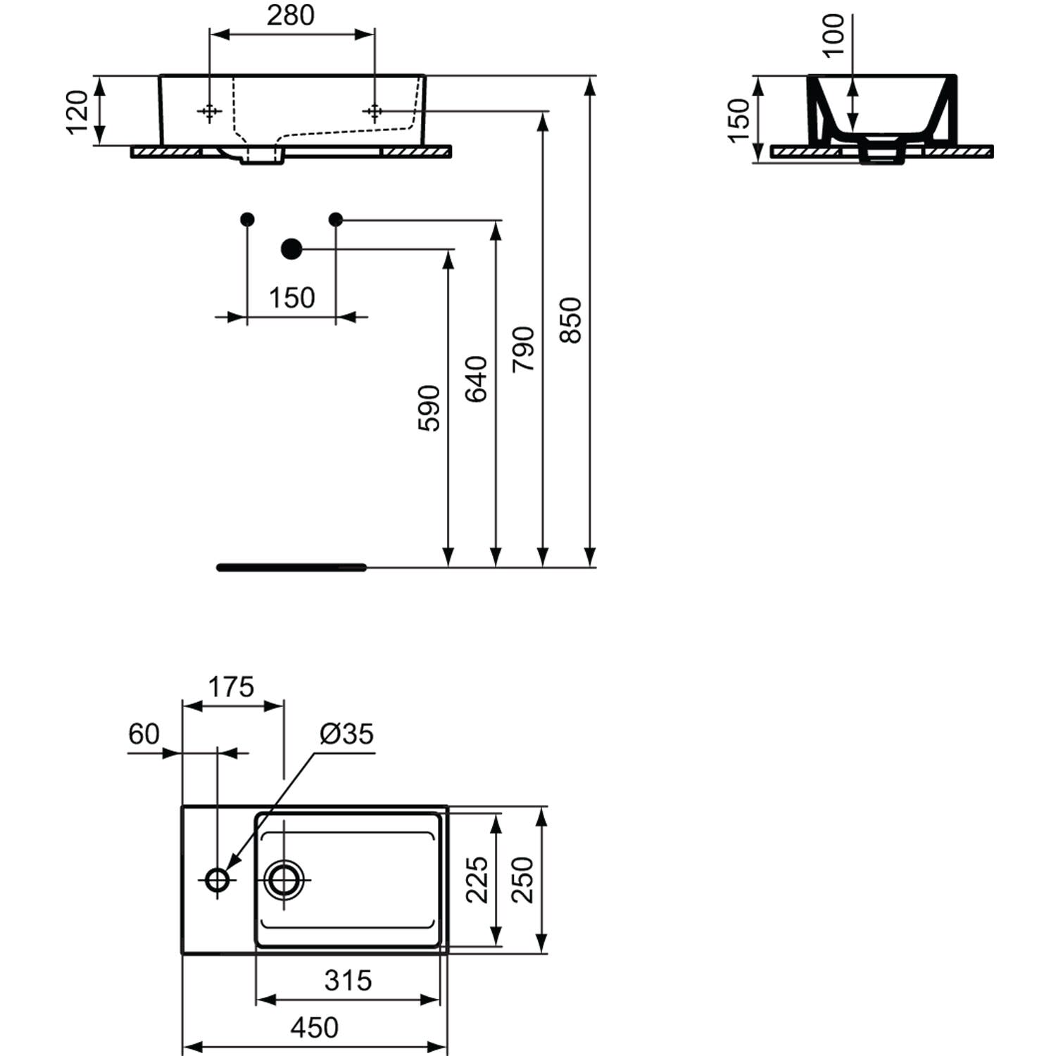 Ideal Standard Extra Handwaschbecken 45 cm, Hahnbank links, 1 Hahnloch, mit Überlauf, geschliffen