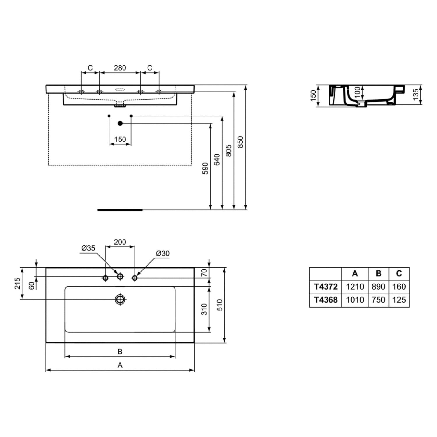 3 Hahnlöcher mit Überlauf