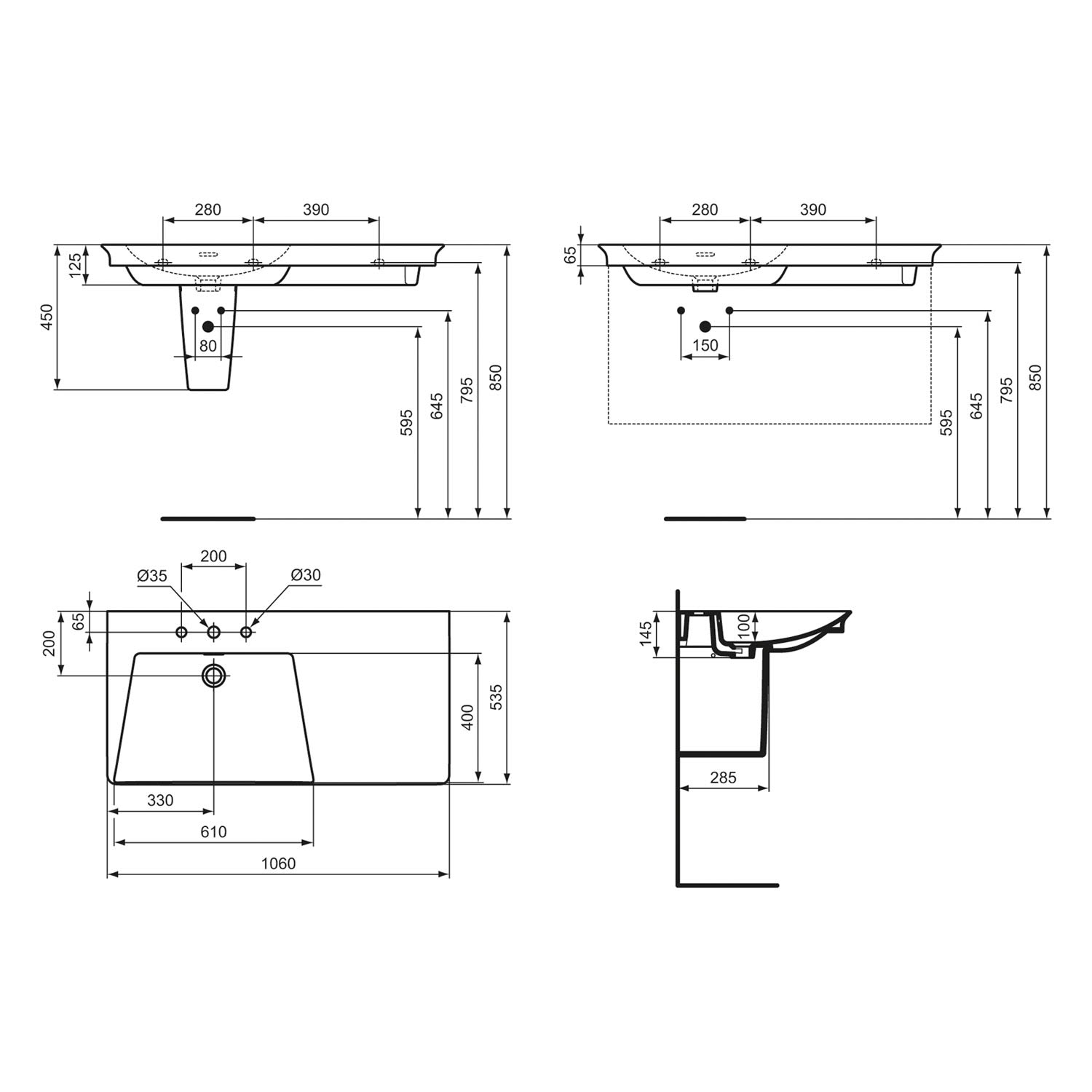 Ideal Standard La Dolce Vita Möbelwaschtisch 106 cm, mit 3 Hahnlöchern, mit Überlauf, Ablage rechts