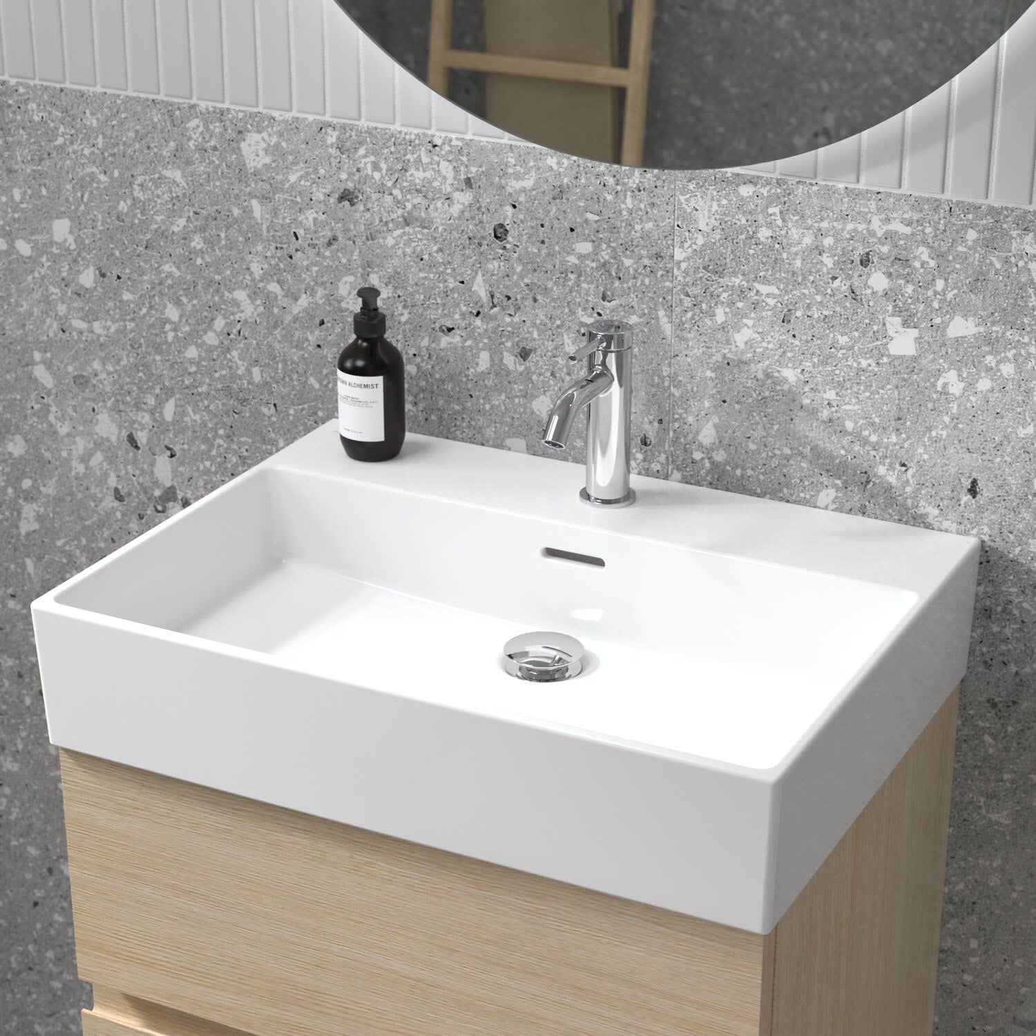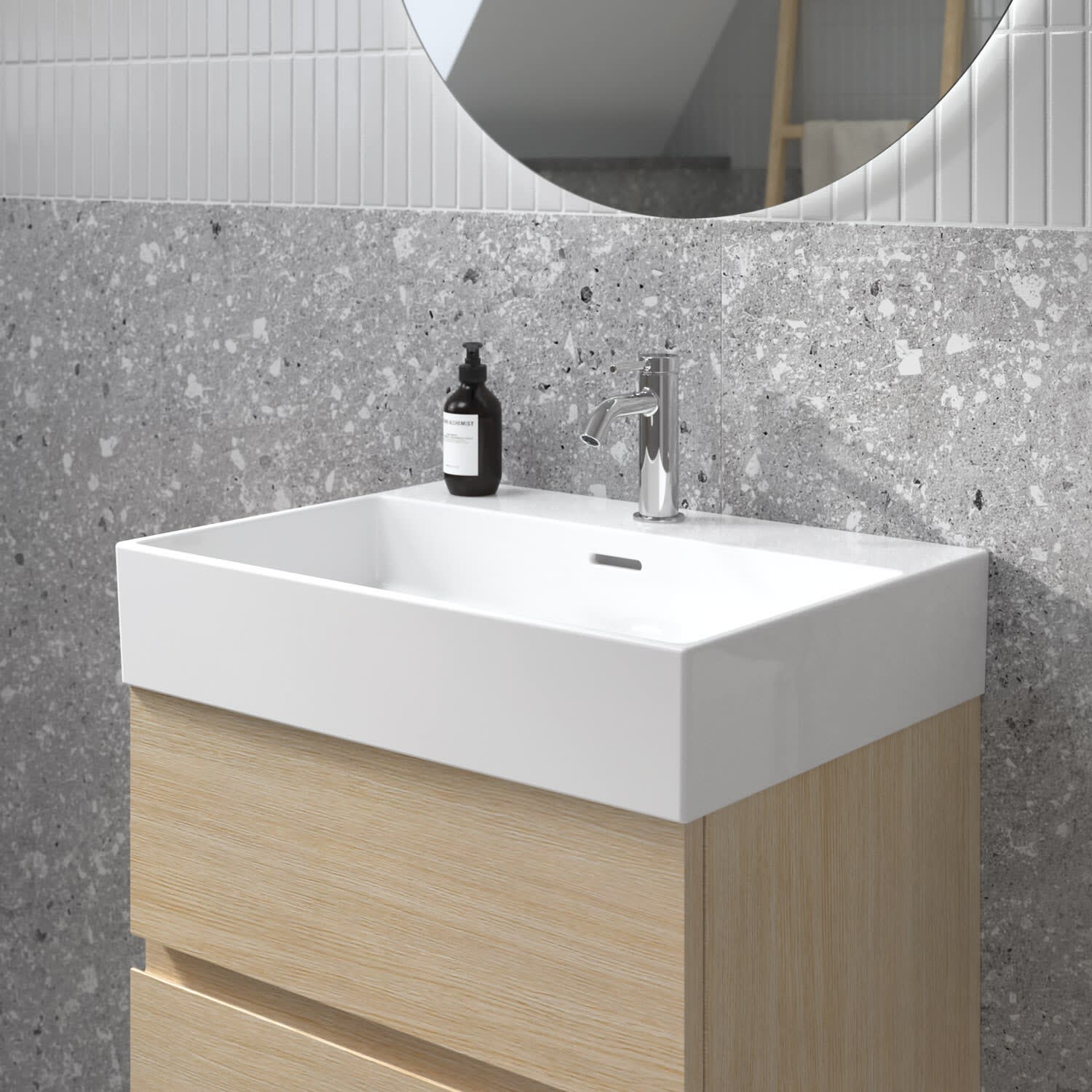 Der Lastani Waschtisch von Ideal Standard überzeugt durch sein klares, eckiges Design und schafft so eine moderne, offene Atmosphäre in jedem Badezimmer. Mit seiner Breite von 61,5 cm bietet der Waschtisch viel Raum für Ihre tägliche Pflegeroutine. Das zentrale Hahnloch ermöglicht individuelle Gestaltungsmöglichkeiten, während der geschlitzte Überlauf für ein elegantes Detail sorgt. Gefertigt aus hochwertigem Feinfeuerton überzeugt der Waschtisch nicht nur durch seine zeitlose Ästhetik, sondern auch durch seine langlebige Qualität.