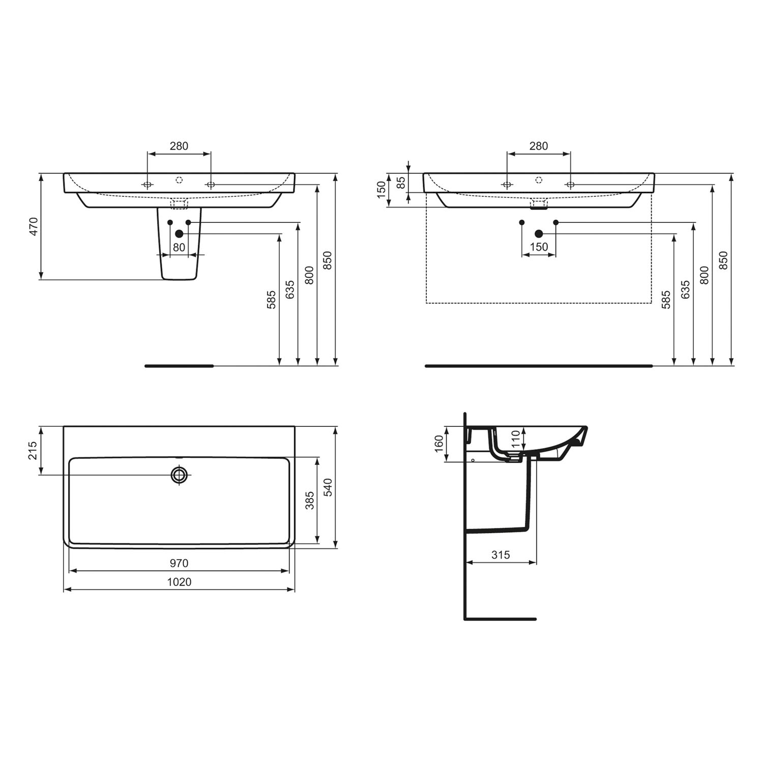 Ideal Standard i.life B Möbelwaschtisch 102 cm, ohne Hahnloch, mit Überlauf
