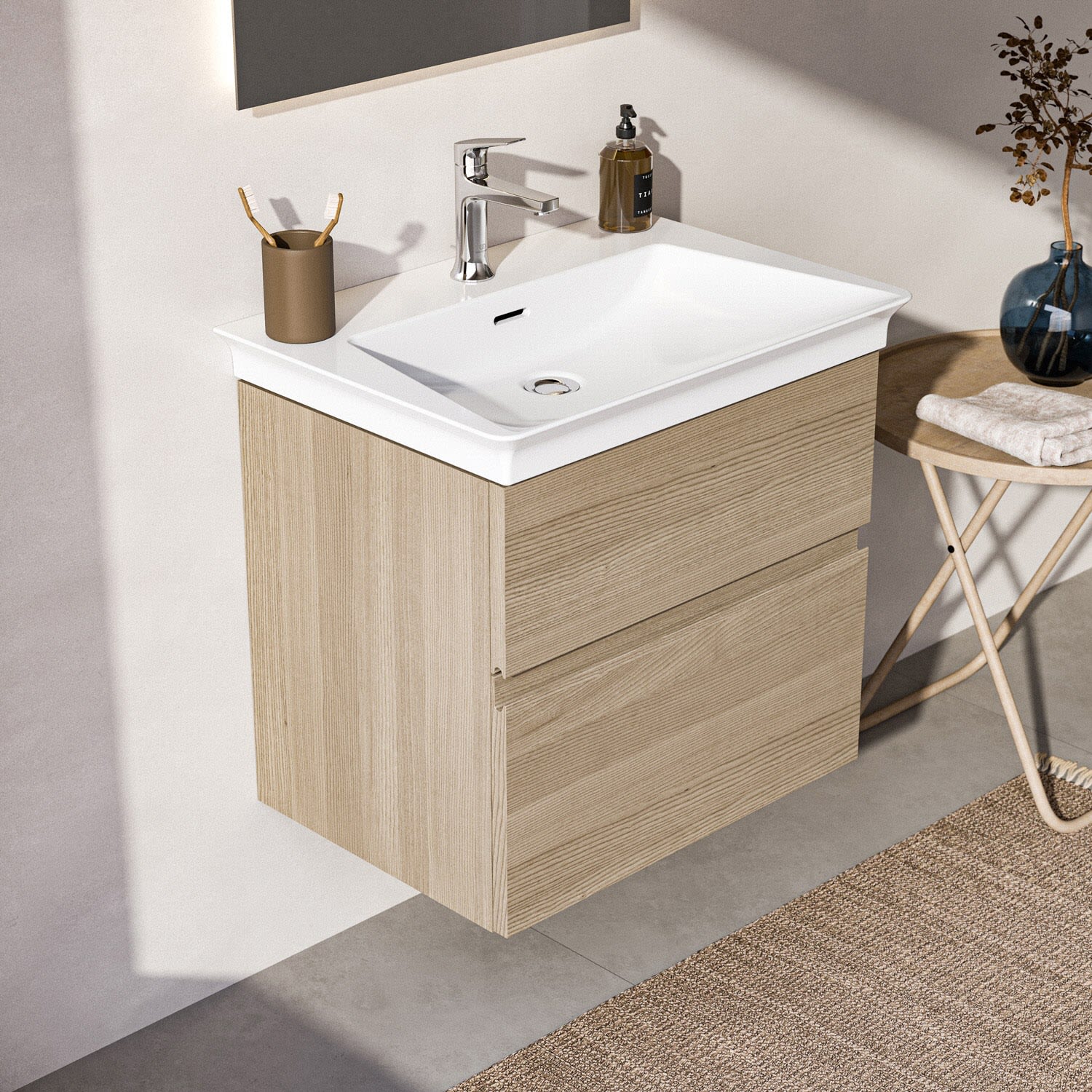 Die Finesse Serie bietet dir Flexibilität, denn der Möbelwaschtischunterschrank ist in drei Tiefen erhältlich. Du findest die perfekte Größe, die deinem Badezimmer und deinen Bedürfnissen entspricht.