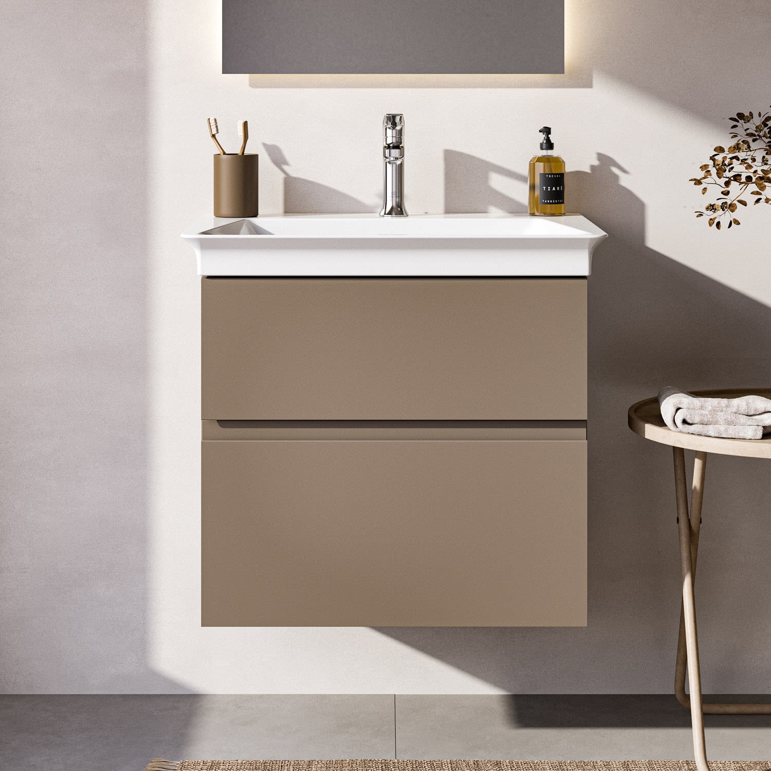 Die Finesse Serie bietet dir Flexibilität, denn der Möbelwaschtischunterschrank ist in drei Tiefen erhältlich. Du findest die perfekte Größe, die deinem Badezimmer und deinen Bedürfnissen entspricht.