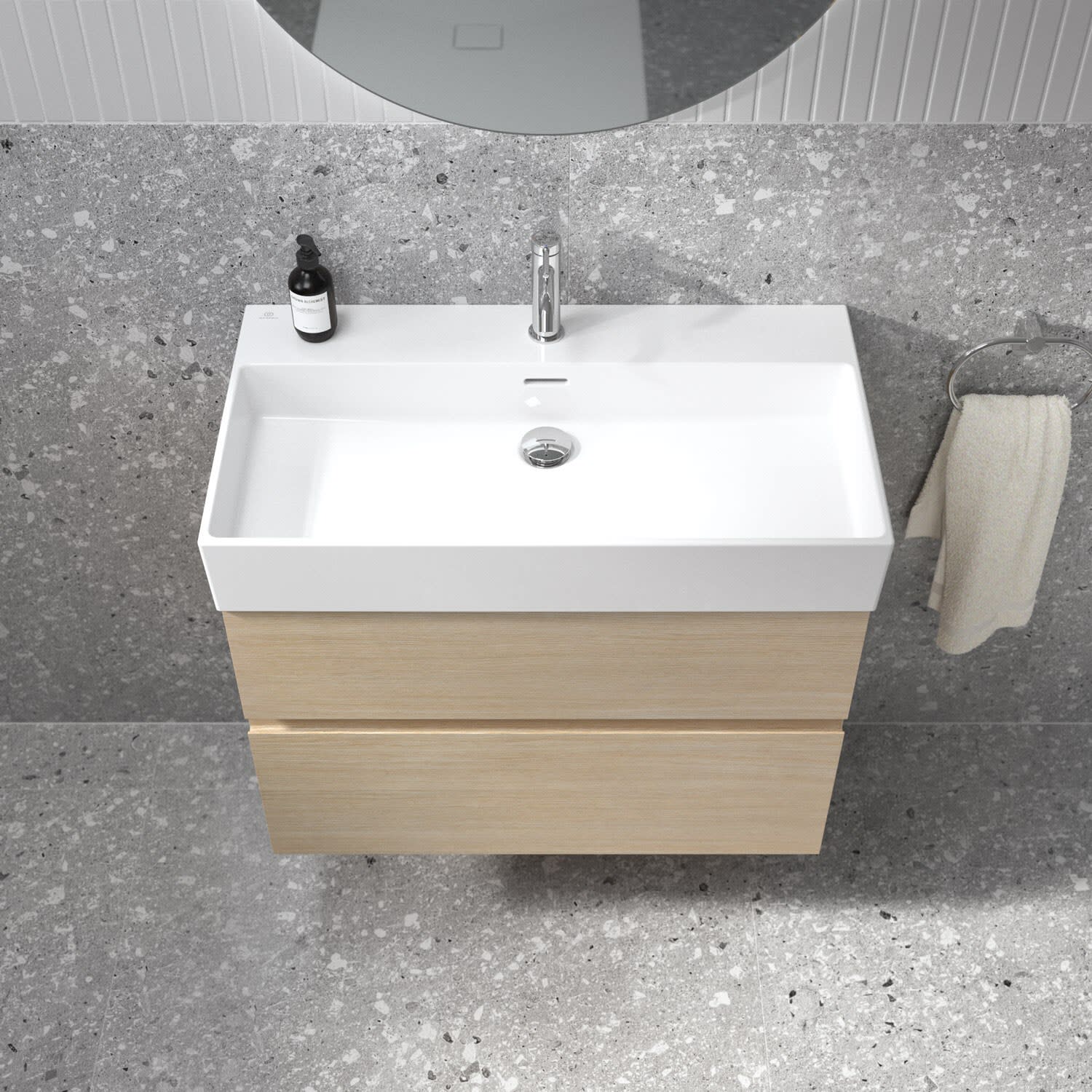 Der Lastani Möbelwaschtischunterschrank von Ideal Standard ist der Inbegriff moderner Raffinesse. Seine schlanken Linien und die dezenten Griffmulden strahlen zeitlose Eleganz aus. Der Unterschrank bietet mit seinen beiden Auszügen ausreichend Stauraum für alle wichtigen Badutensilien. Der Softclose-Mechanismus ermöglicht ein geräuschloses und sanftes Schließen für eine angenehme Nutzung. Ob im hektischen Alltag oder bei einem entspannten Morgenritual – der Softclose-Mechanismus sorgt für Komfort, auf den Sie nie wieder verzichten möchten. Ideal Standard setzt sich für Nachhaltigkeit ein: Das verwendete Holz stammt aus nachhaltigen Quellen. Kombiniert mit dem Lastani Waschtisch der durch sein klares, eckiges Design eine moderne, offene Atmosphäre in jedem Badezimmer schafft. Mit einer Breite von 81,5 cm bietet der Waschtisch viel Raum für Ihre tägliche Pflegeroutine. Das zentrale Hahnloch ermöglicht individuelle Gestaltungsmöglichkeiten, während der geschlitzte Überlauf für ein elegantes Detail sorgt. Gefertigt aus hochwertigem Feinfeuerton überzeugt der Waschtisch nicht nur durch seine zeitlose Ästhetik, sondern auch durch seine langlebige Qualität.