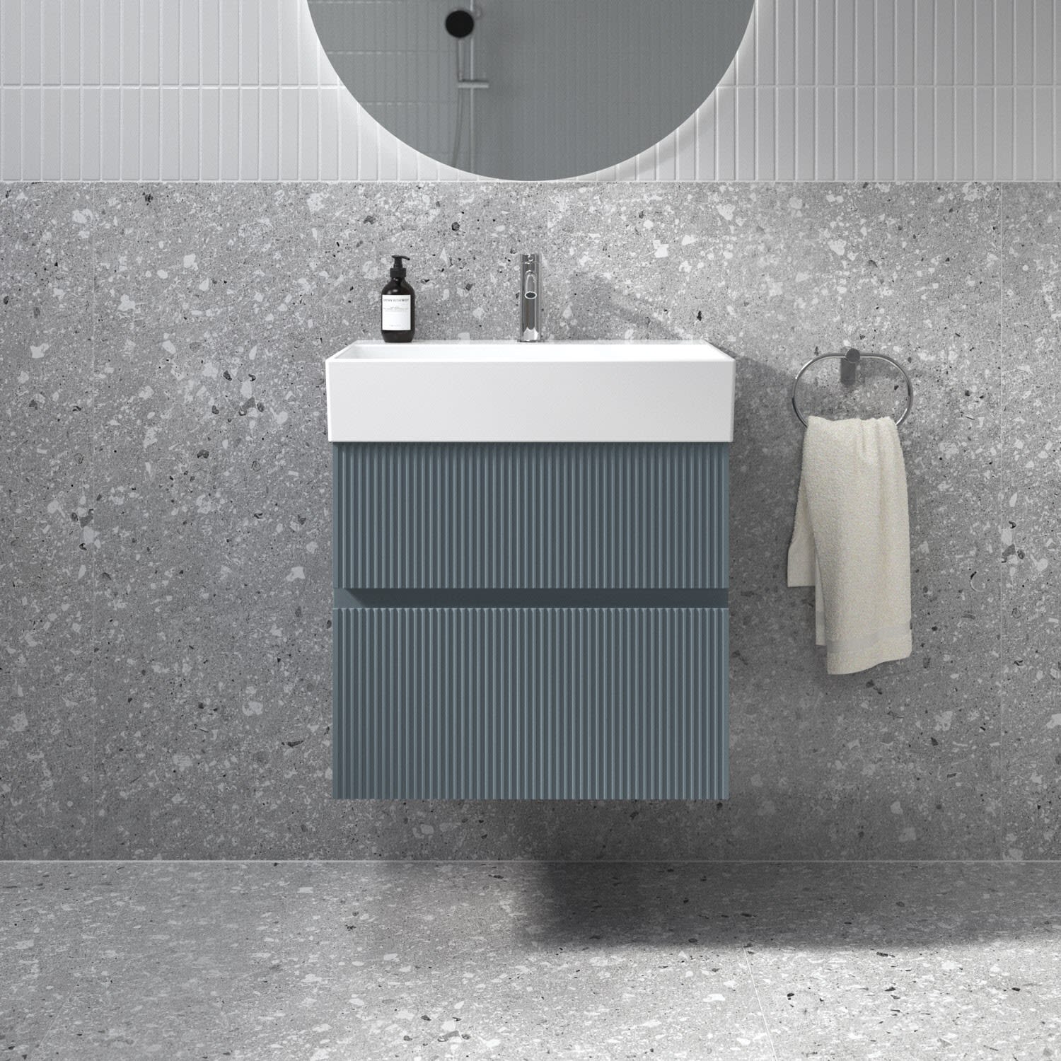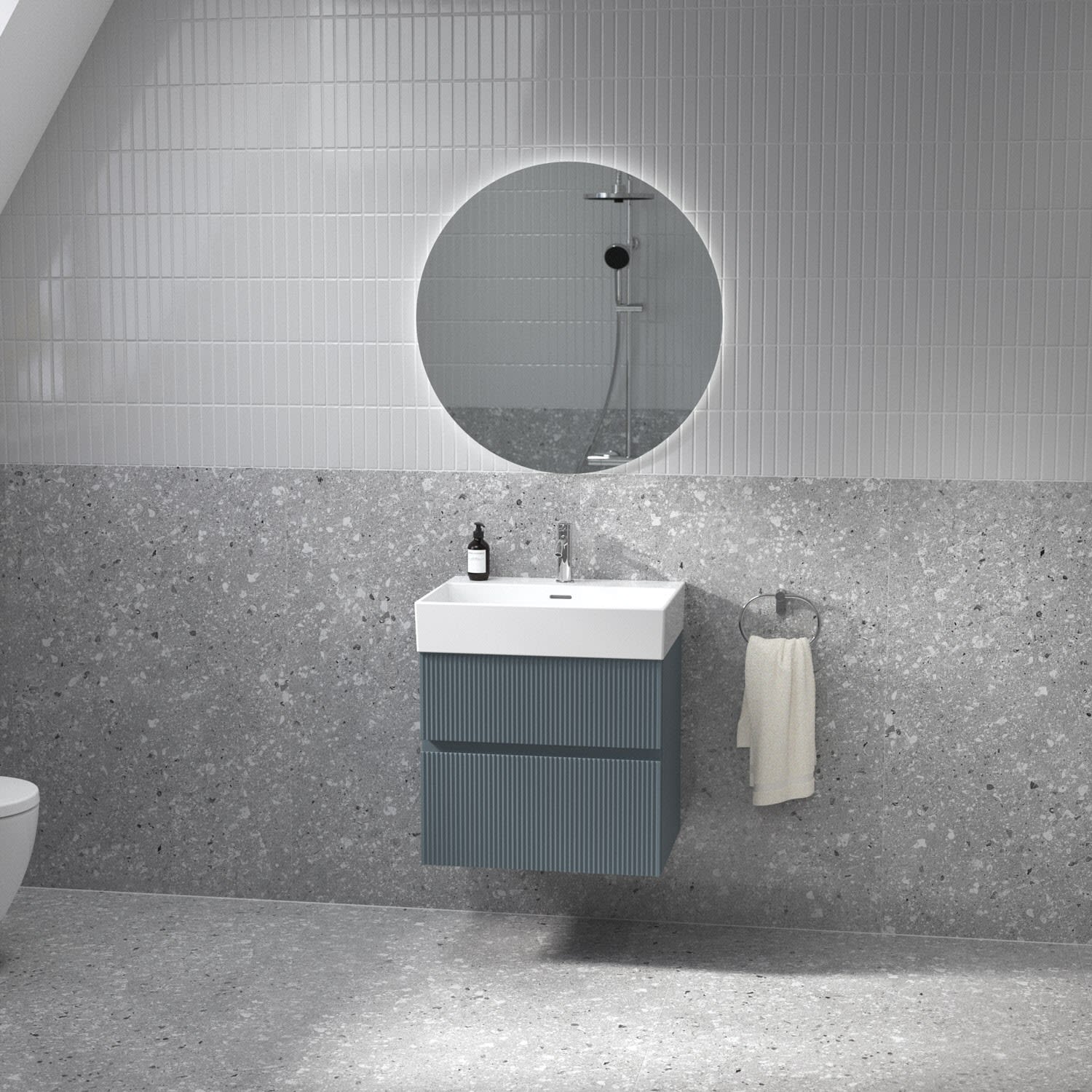 Kombiniert mit dem Lastani Waschtisch, gefertigt aus hochwertigem Feinfeuerton, der durch sein klares, eckiges Design eine moderne, offene Atmosphäre in jedem Badezimmer schafft. Mit einer Breite von 61,5 cm bietet der Waschtisch viel Raum für Ihre tägliche Pflegeroutine. Das zentrale Hahnloch ermöglicht individuelle Gestaltungsmöglichkeiten, während der geschlitzte Überlauf für ein elegantes Detail sorgt.