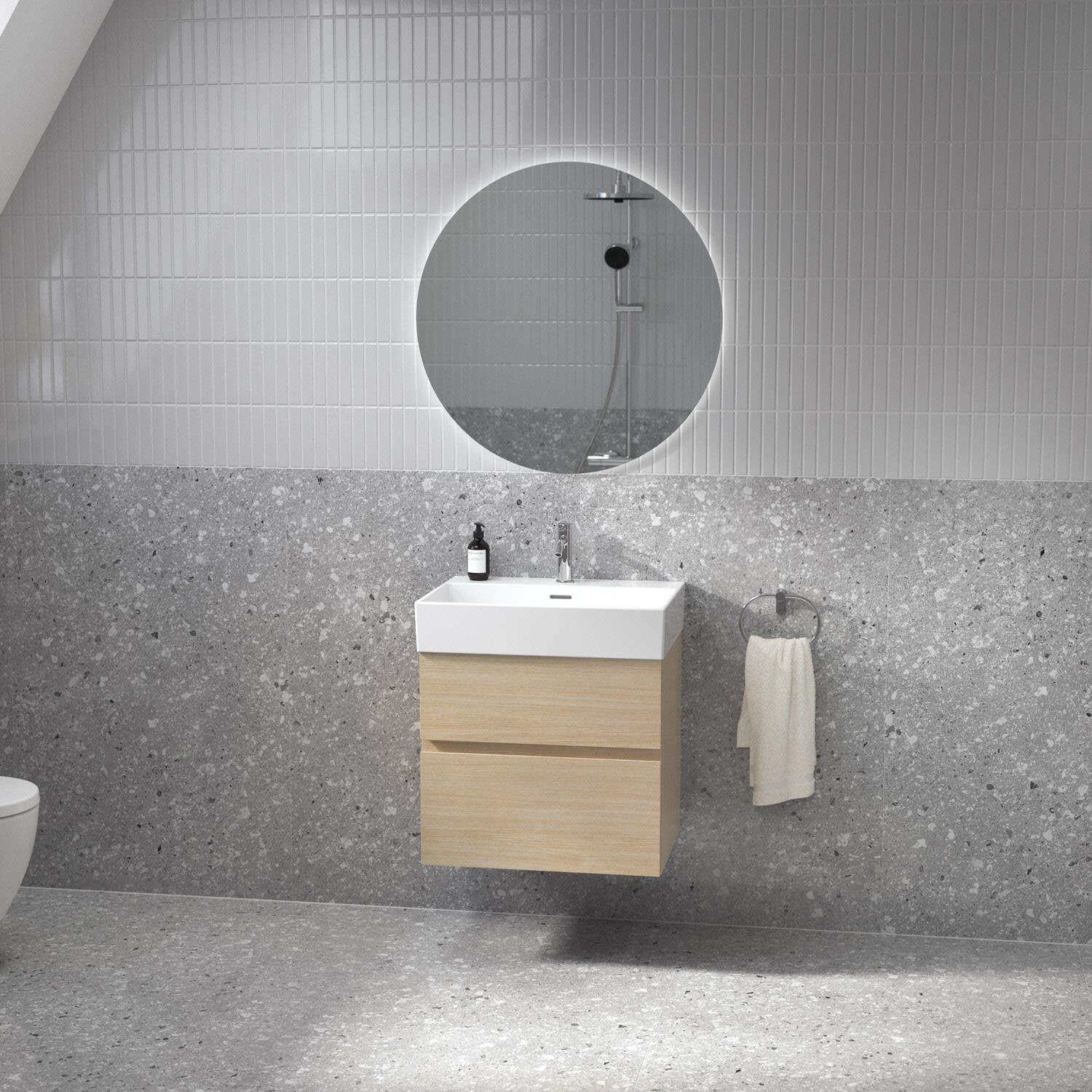 Kombiniert mit dem Lastani Waschtisch, gefertigt aus hochwertigem Feinfeuerton, der durch sein klares, eckiges Design eine moderne, offene Atmosphäre in jedem Badezimmer schafft. Mit einer Breite von 61,5 cm bietet der Waschtisch viel Raum für Ihre tägliche Pflegeroutine. Das zentrale Hahnloch ermöglicht individuelle Gestaltungsmöglichkeiten, während der geschlitzte Überlauf für ein elegantes Detail sorgt.