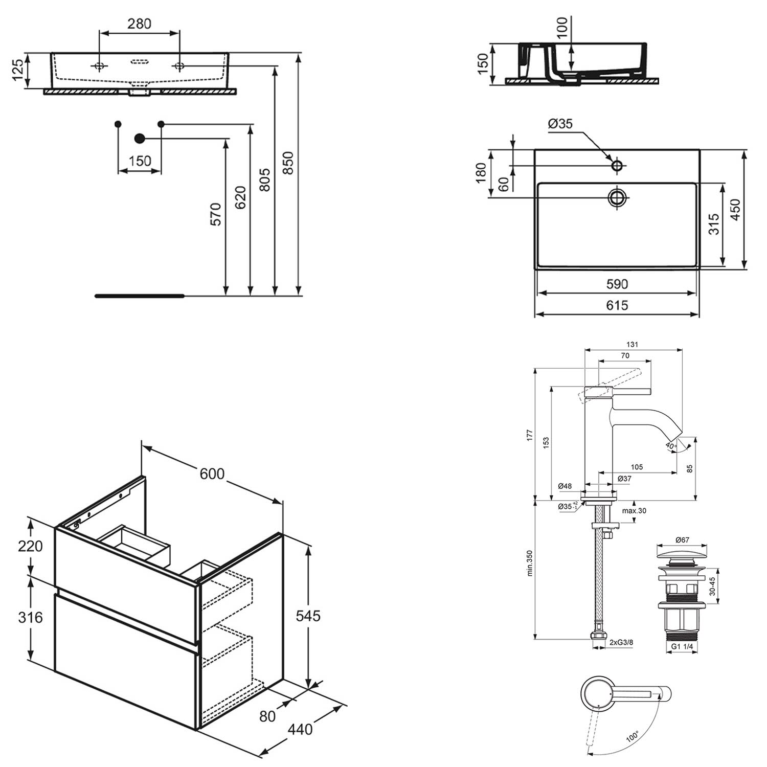 Ideal Standard Lastani Waschtisch mit Unterschrank und Waschtischarmatur 61,5 cm