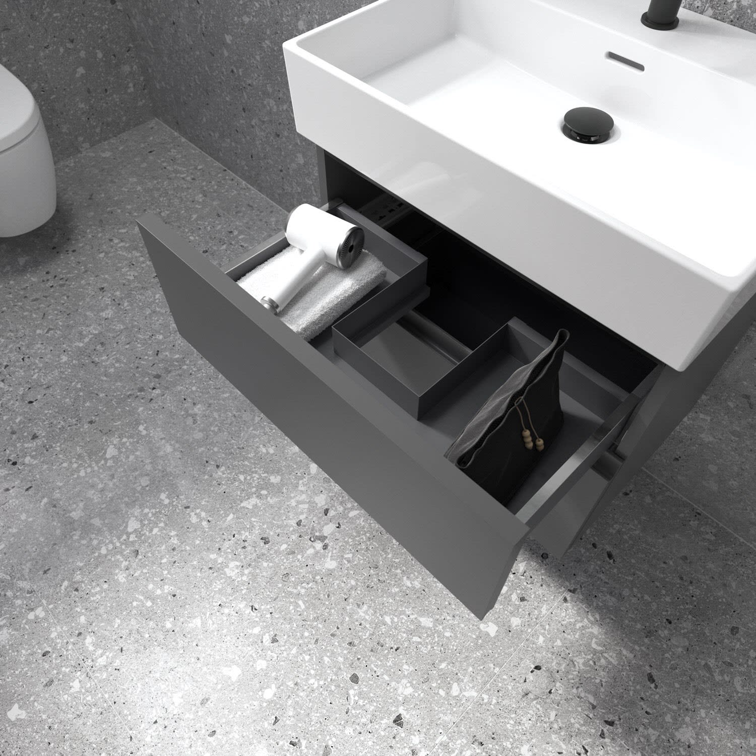 Der Lastani Möbelwaschtischunterschrank von Ideal Standard ist der Inbegriff moderner Raffinesse. Seine schlanken Linien und die dezenten Griffmulden strahlen zeitlose Eleganz aus. Der Unterschrank bietet mit seinen beiden Auszügen ausreichend Stauraum für alle wichtigen Badutensilien. Der Softclose-Mechanismus ermöglicht ein geräuschloses und sanftes Schließen. Ideal Standard setzt sich für Nachhaltigkeit ein: Das verwendete Holz stammt aus nachhaltigen Quellen.