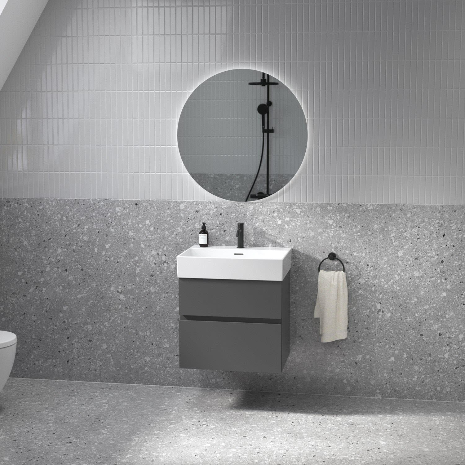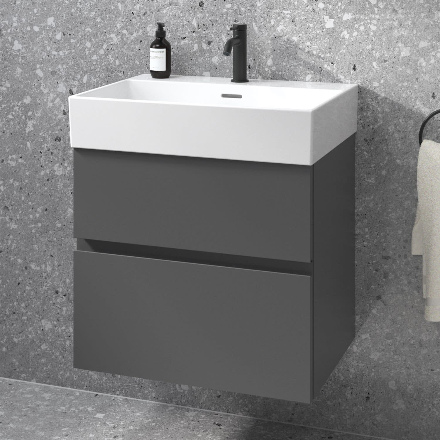 Kombiniert mit dem Lastani Waschtisch, gefertigt aus hochwertigem Feinfeuerton, der durch sein klares, eckiges Design eine moderne, offene Atmosphäre in jedem Badezimmer schafft. Mit einer Breite von 61,5 cm bietet der Waschtisch viel Raum für Ihre tägliche Pflegeroutine. Das zentrale Hahnloch ermöglicht individuelle Gestaltungsmöglichkeiten, während der geschlitzte Überlauf für ein elegantes Detail sorgt.