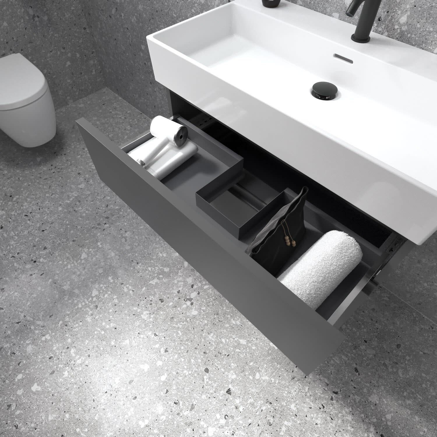 Der Lastani Möbelwaschtischunterschrank von Ideal Standard ist der Inbegriff moderner Raffinesse. Seine schlanken Linien und die dezenten Griffmulden strahlen zeitlose Eleganz aus. Der Unterschrank bietet mit seinen beiden Auszügen ausreichend Stauraum für alle wichtigen Badutensilien. Der Softclose-Mechanismus ermöglicht ein geräuschloses und sanftes Schließen. Ideal Standard setzt sich für Nachhaltigkeit ein: Das verwendete Holz stammt aus nachhaltigen Quellen.