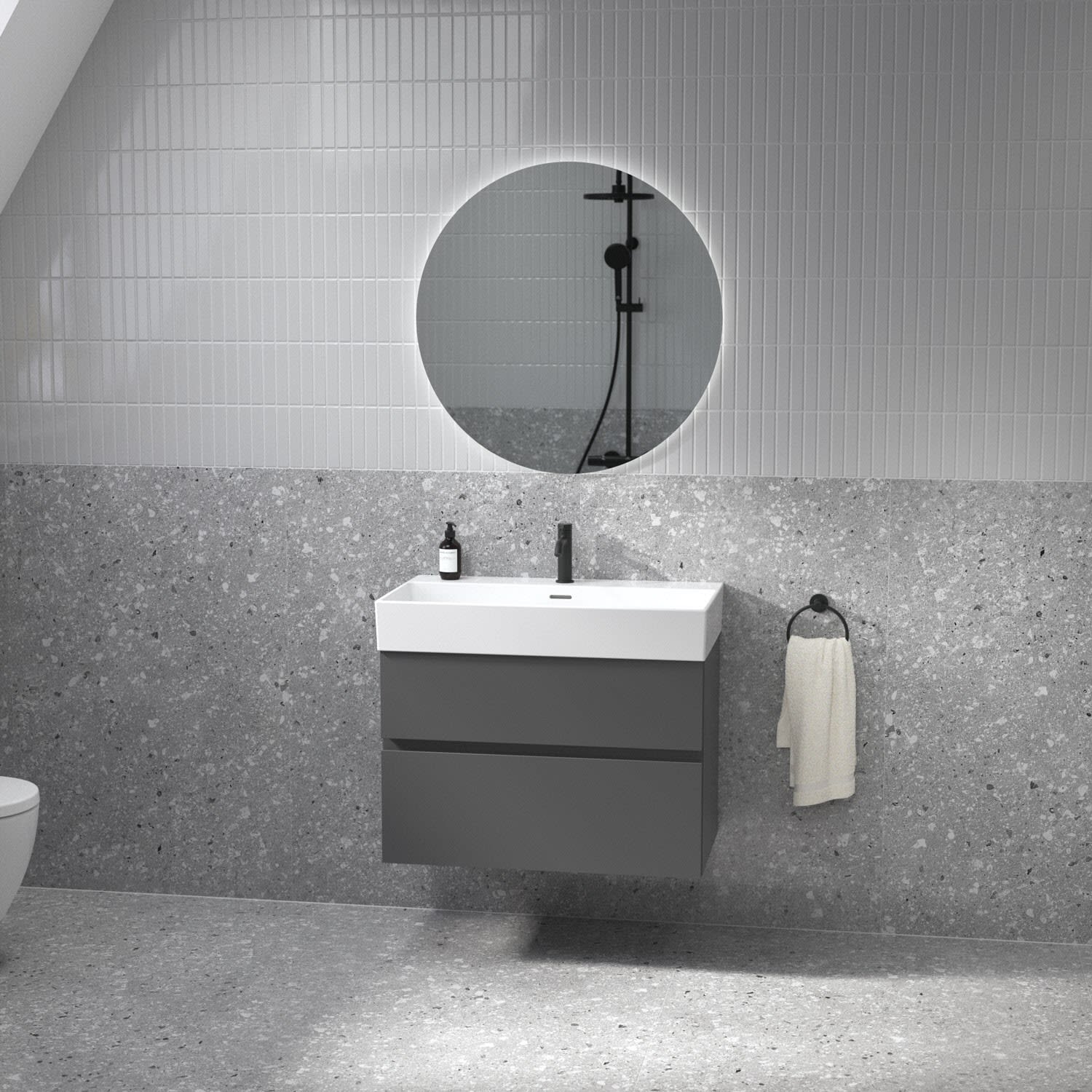 Kombiniert mit dem Lastani Waschtisch, gefertigt aus hochwertigem Feinfeuerton, der durch sein klares, eckiges Design eine moderne, offene Atmosphäre in jedem Badezimmer schafft. Mit einer Breite von 81,5 cm bietet der Waschtisch viel Raum für Ihre tägliche Pflegeroutine. Das zentrale Hahnloch ermöglicht individuelle Gestaltungsmöglichkeiten, während der geschlitzte Überlauf für ein elegantes Detail sorgt.