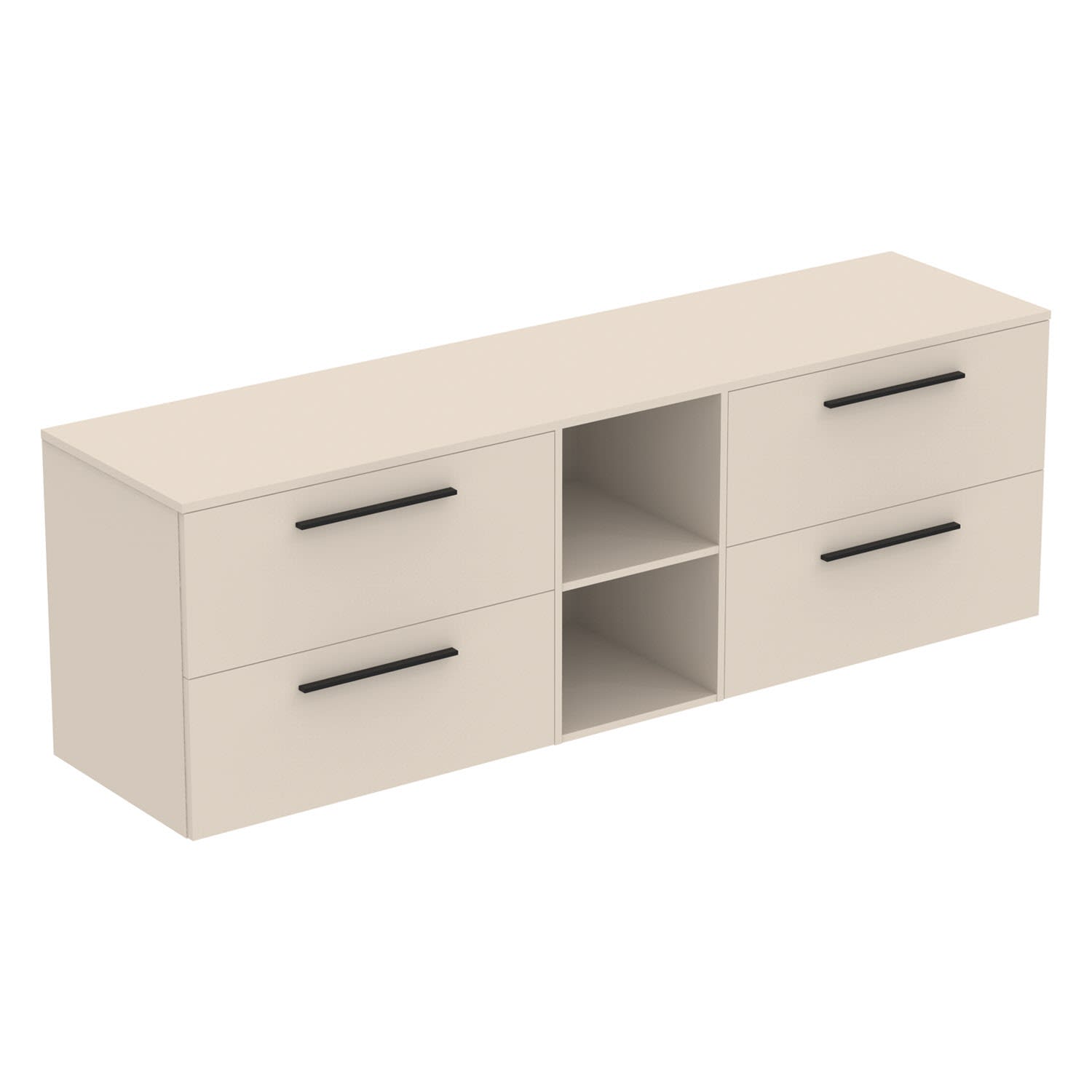 Das i.life B Möbel-Set von Ideal Standard ist die perfekte Wahl für ein stilvolles und funktionales Badezimmer. Das Set besteht aus zwei Möbelwaschtischunterschränken, die jeweils zwei Auszüge haben, Möbelgriffen, einem Element mit zwei offenen Fächern und einer Waschtischplatte.