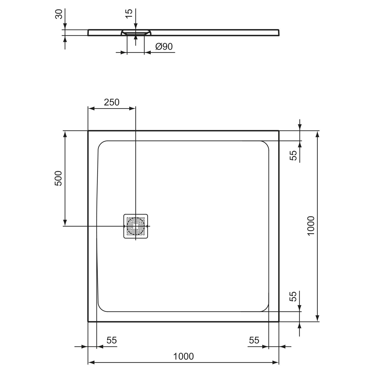 - Position Ablaufloch: 250 mm von Mitte Seite