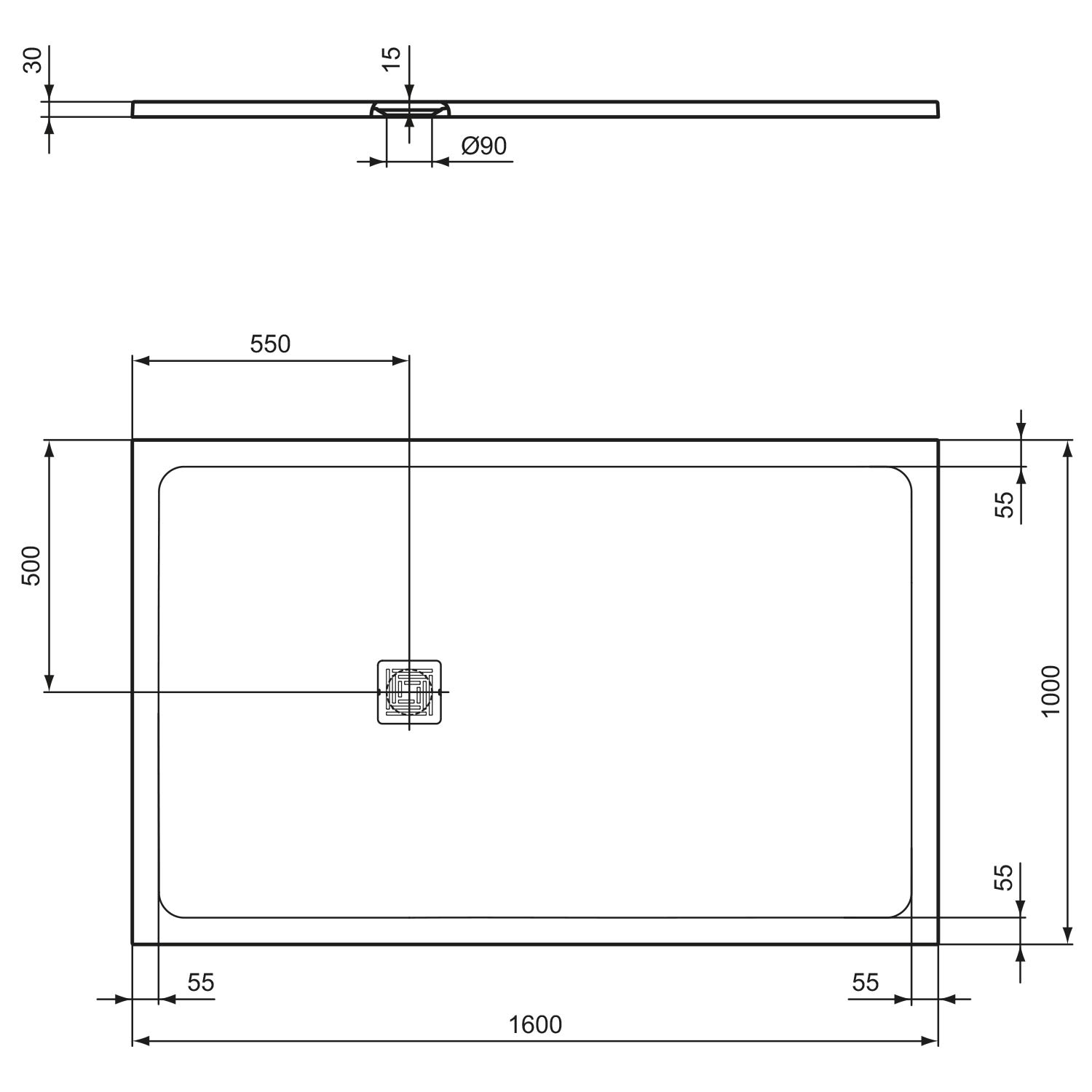 - Position Ablaufloch: 550 mm von Mitte kurzer Seite