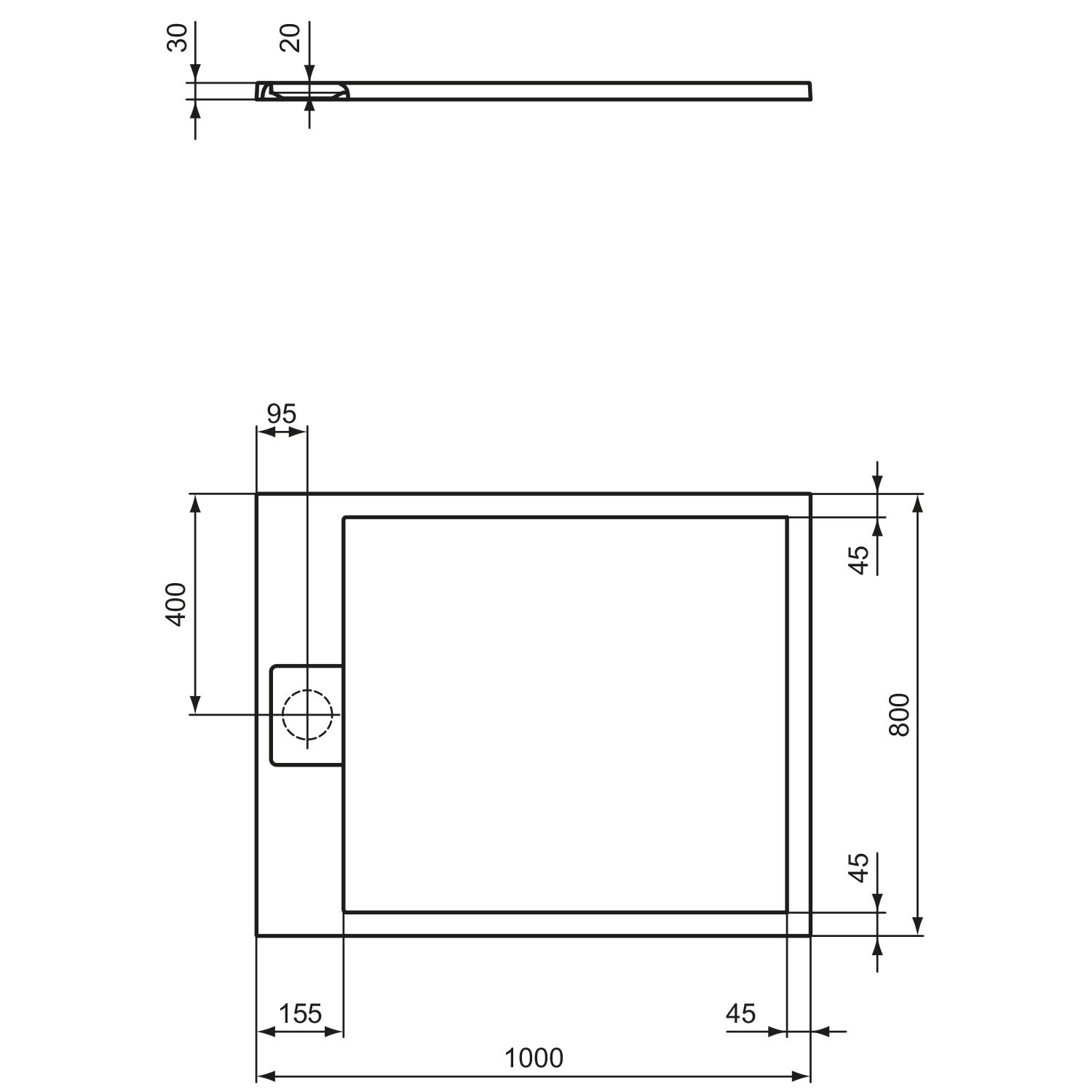 - ultraflache Duschwanne ohne Kanten mit 15 mm Innentiefe
