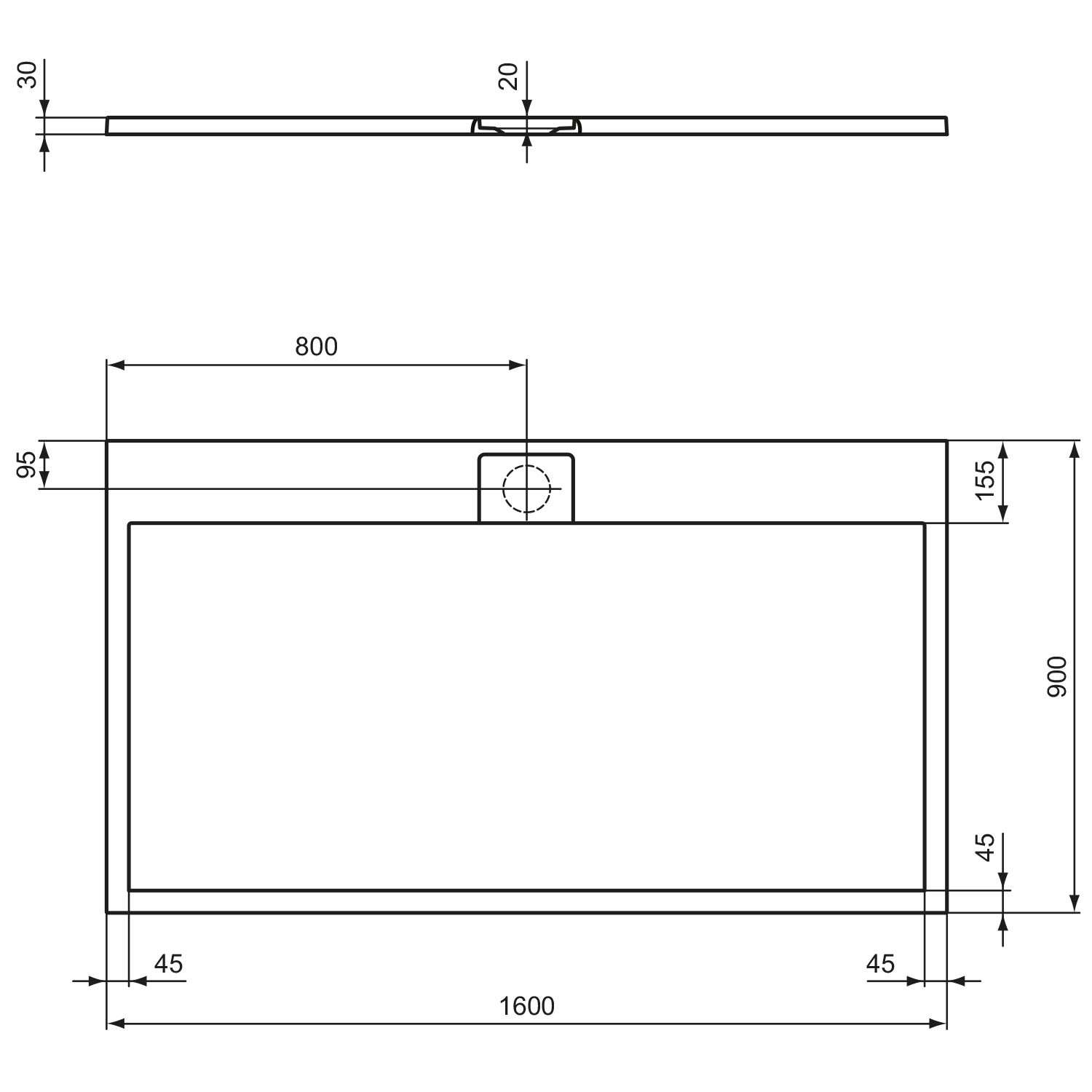 - Ablaufloch: Mitte Längs-/ Querseite