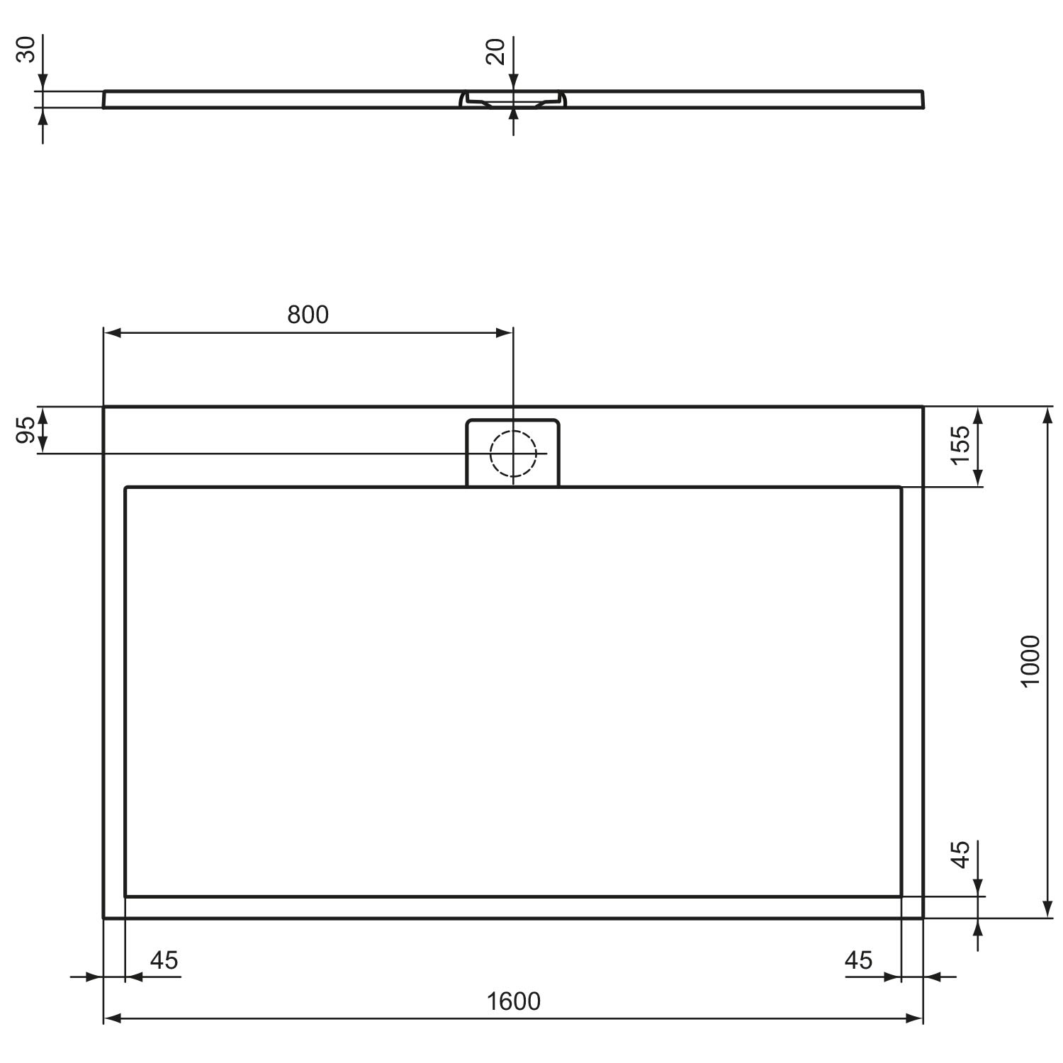 - ultraflache Duschwanne ohne Kanten mit 15 mm Innentiefe