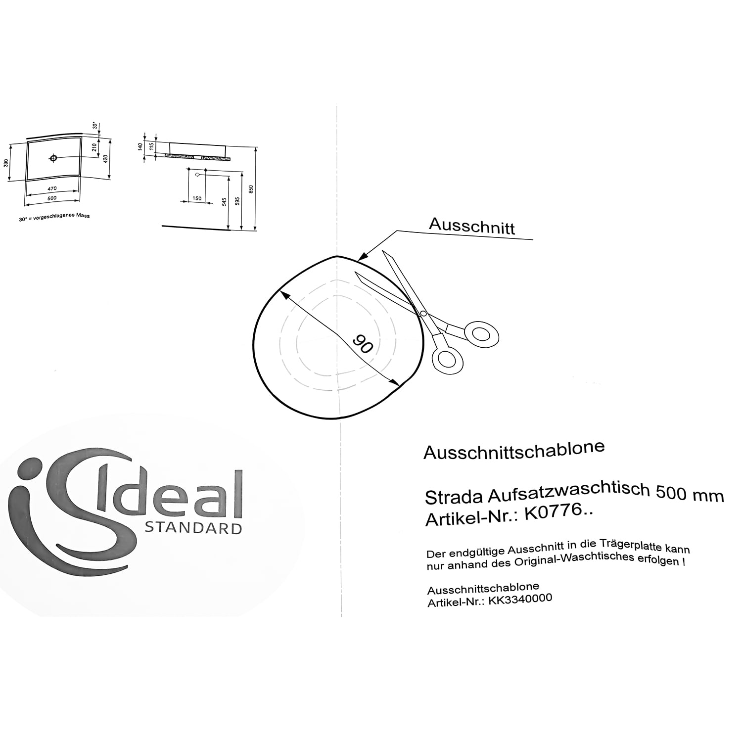 Ideal Standard Ausschnittschablone für Strada Aufsatzwaschtisch 50 cm
