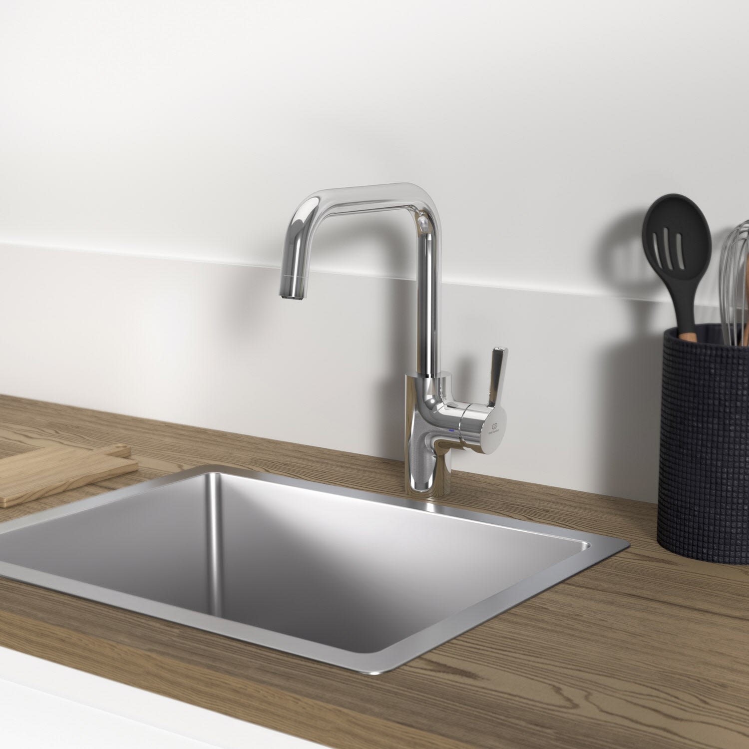 Die Ceralife Küchenarmatur von Ideal Standard vereint modernes Design mit praktischer Funktionalität. Die Küchenarmatur ist mit einer Niederdruck-Funktion ausgestattet, perfekt für die Verwendung mit einem Warmwasserboiler.