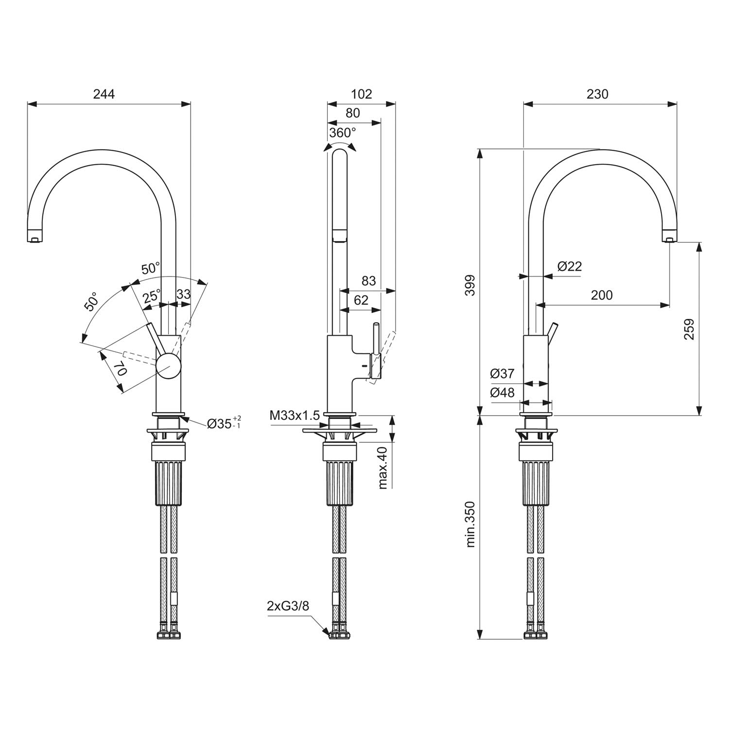 - 3,5 cm erforderlicher Hahnlochdurchmesser