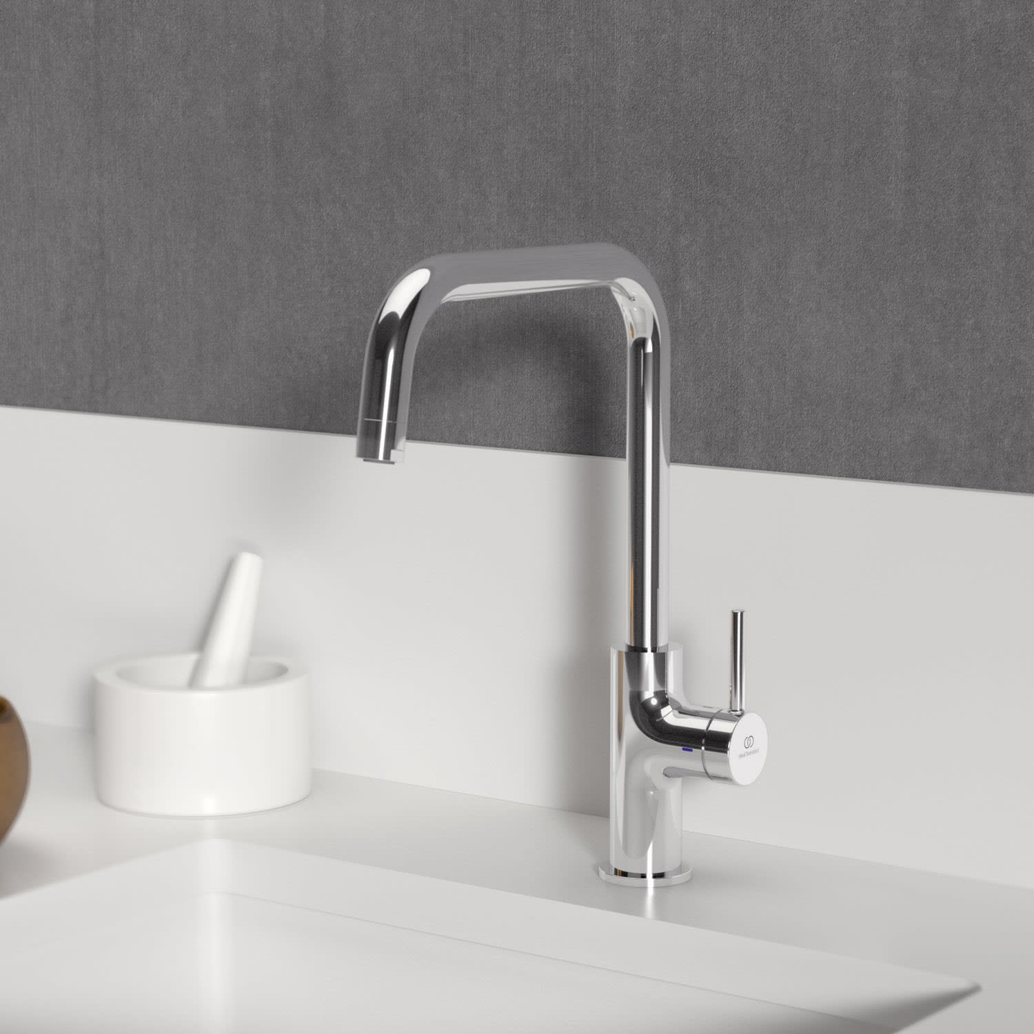 Die Ceraline Nuovo Küchenarmatur von Ideal Standard vereint modernes Design mit praktischer Funktionalität. Mit ihrem U-förmigen Auslauf und dem 360° Schwenkbereich bietet sie Ihnen maximale Flexibilität beim Arbeiten in der Küche. Die Auslaufhöhe von 23,5 cm sorgt für genügend Platz für Töpfe und Schüsseln. Mit dem integrierten Luftsprudler genießen Sie einen angenehm weichen Wasserstrahl und die integrierte Temperaturbegrenzung schützt vor zu heißem Wasser. Dank des Easy-Fix+ Schnellmontagesystems lässt sich die Armatur besonders einfach installieren und sorgt für ein schnelles und stressfreies Montageerlebnis. Überzeugen Sie sich selbst und erleben Sie die Vorteile dieser Küchenarmatur in Ihrem Zuhause.