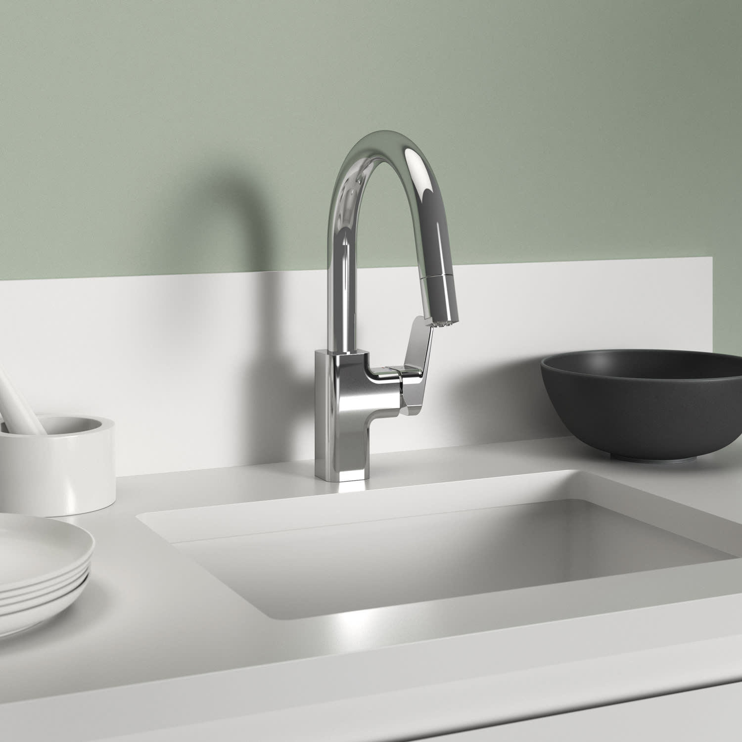 - Auslauf: drehbar, ausziehbar mit Handbrause (Rohr), 1-Funktion