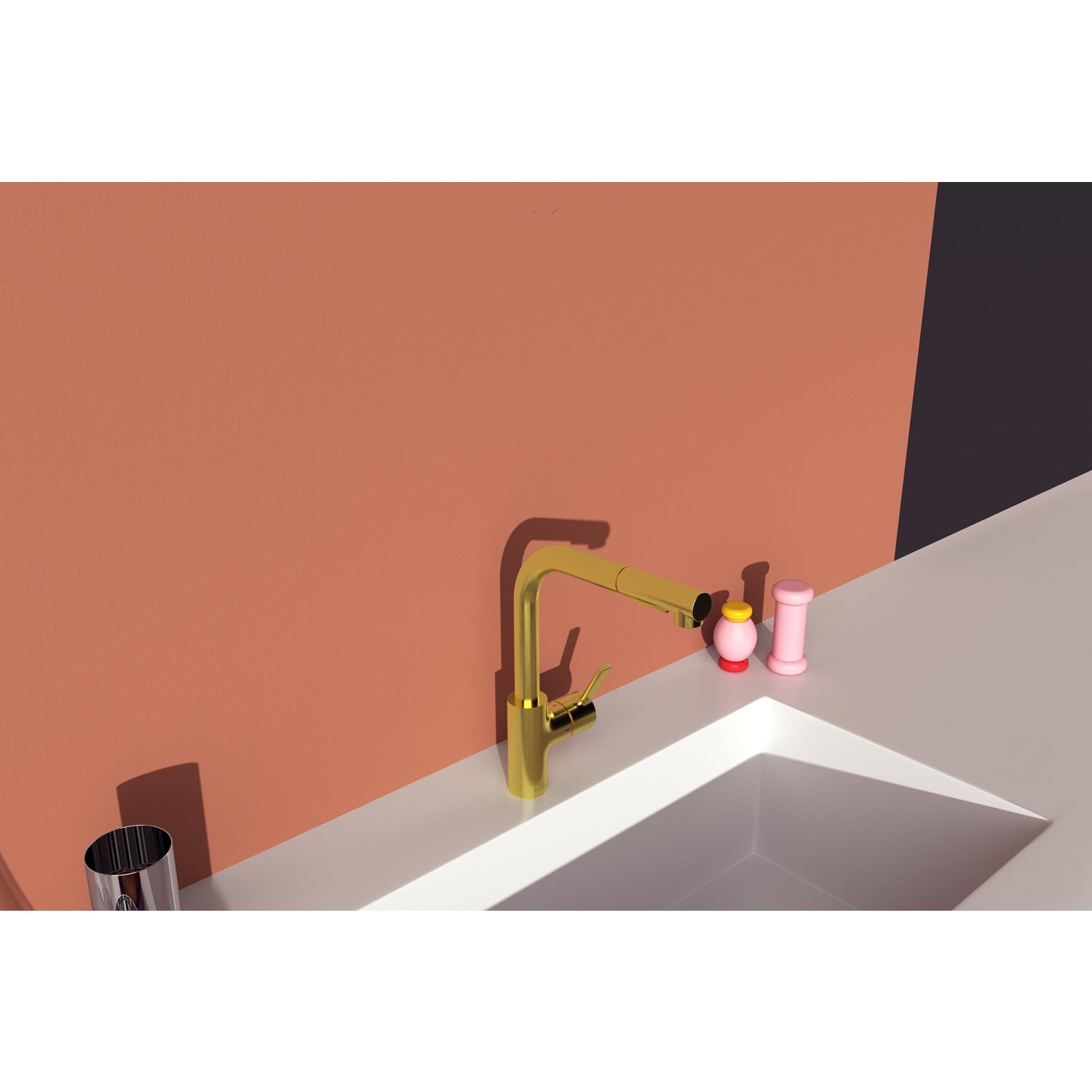 - Auslauf: drehbar, ausziehbar mit Handbrause (Rohr)