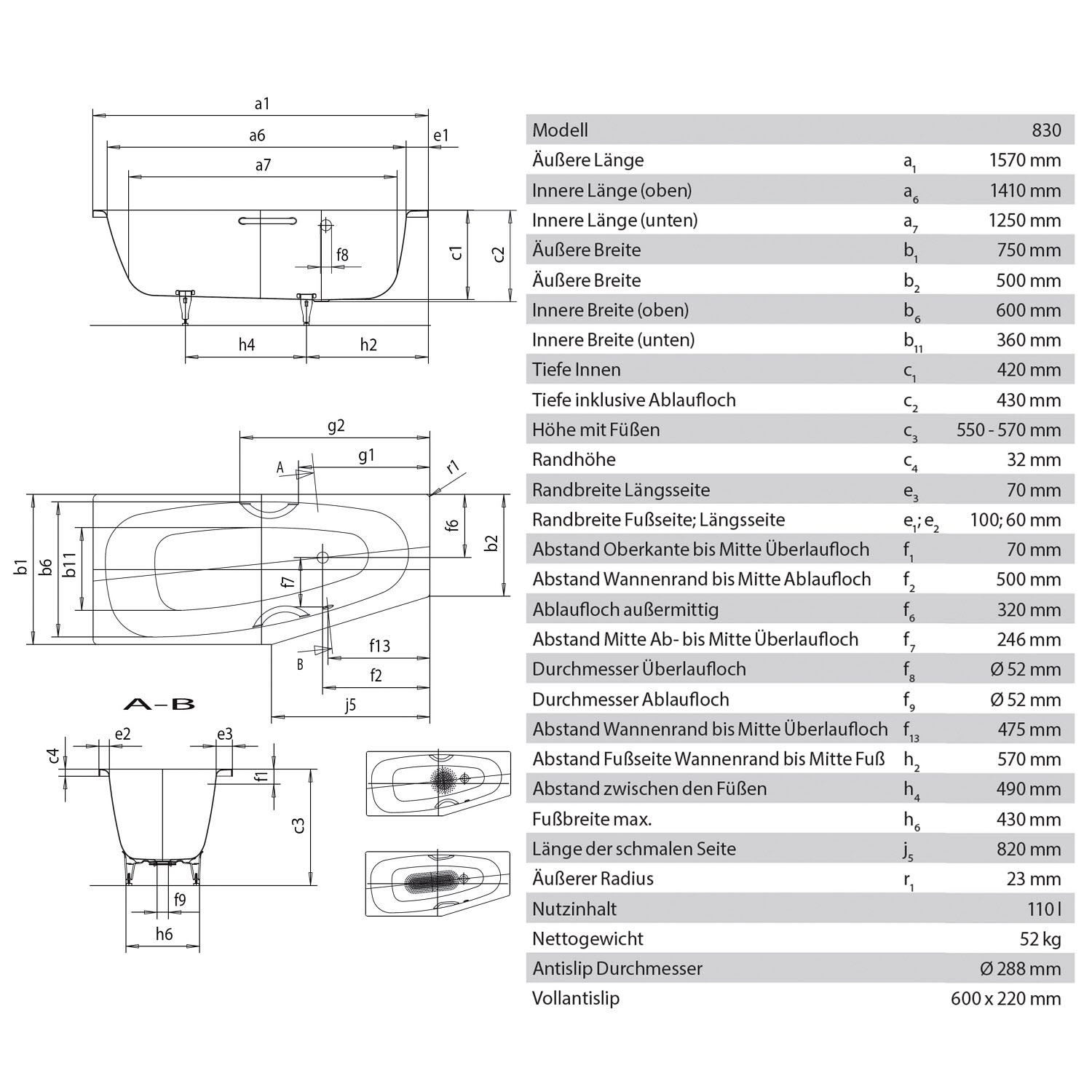 - einsitzige Wanne mit seitlich positionierten Überlauf