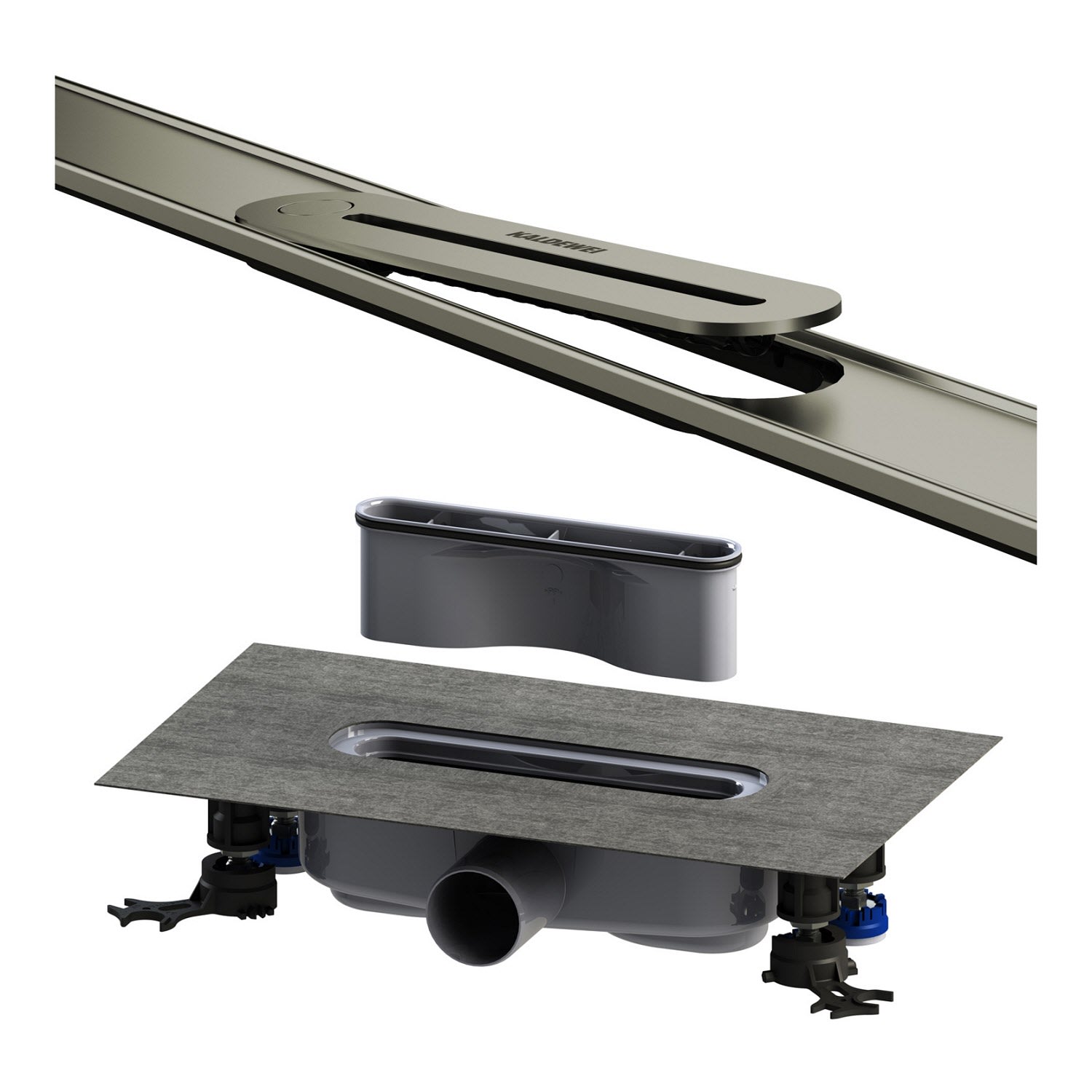 - Enthalten sind: Anschlussrohr, Grundkörper, Bodenbefestigung, höhenverstellbare Garniturfüße, Dichtmanschette, Siphon, Bauzeitenschutz