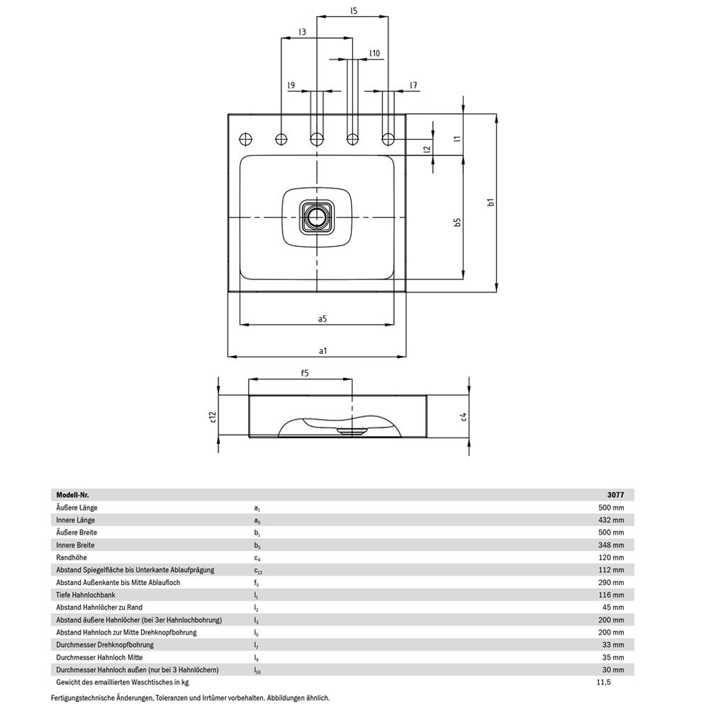 Kaldewei CONO Aufsatzwaschtisch 3077 ohne Hahnlochbohrung, 50 cm