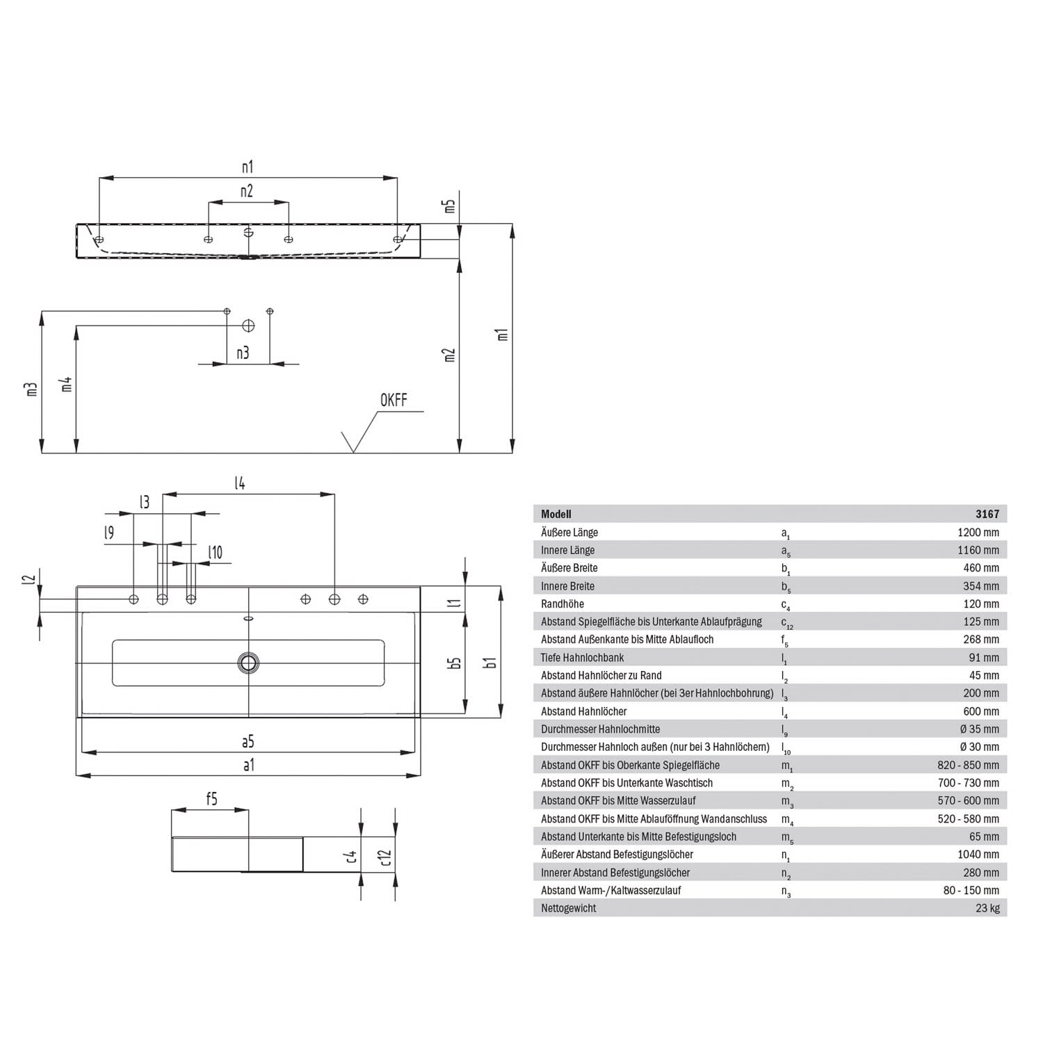 Kaldewei PURO Wandwaschtisch 3167 mit 2 Hahnlochbohrungen, 120 cm