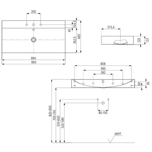 Kaldewei SILENIO Wandwaschtisch 3045 mit 3 Hahnlochbohrungen, mit Überlauf , 90 cm