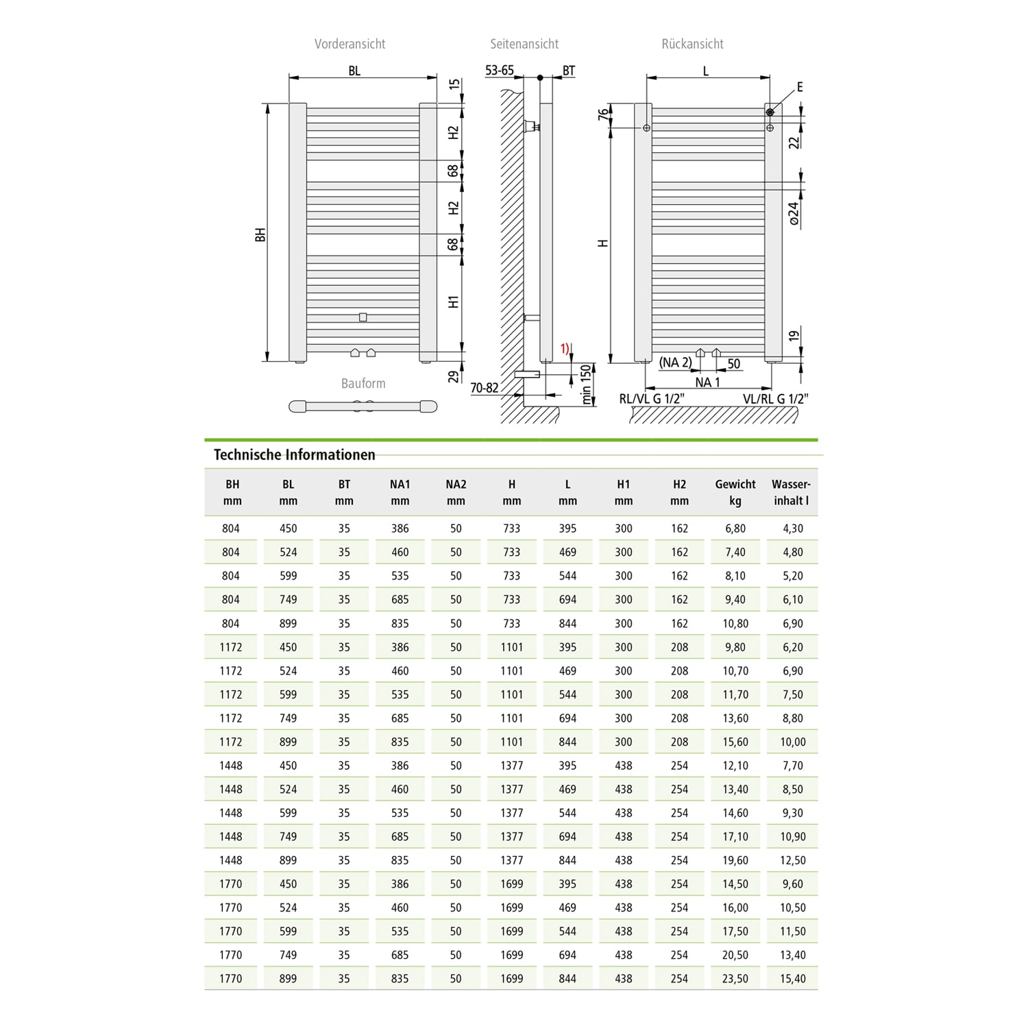 - zusätzlich seitlich 2 x G 1/2“ IG nach unten, Nabenabstand baulängenabhängig, Vorlauf links oder rechts möglich