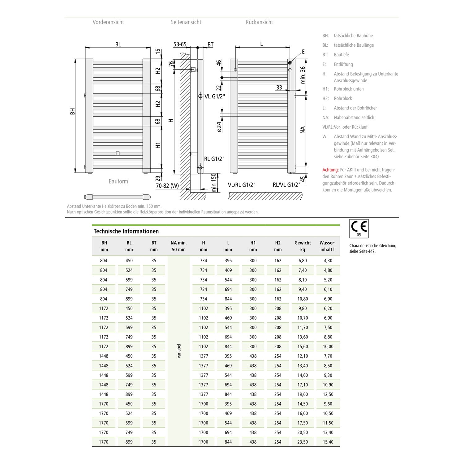 - Anschlüsse: 2 x G 1/2“ IG seitlich rechts im Sammelrohr, Nabenabstand 5 cm, Vorlauf oben