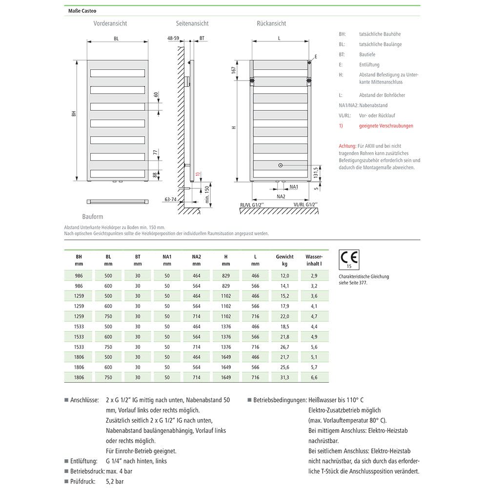 - 2 x G 1/2“ Innengewinde mittig nach unten, Nabenabstand 5 cm, Vorlauf links oder rechts möglich