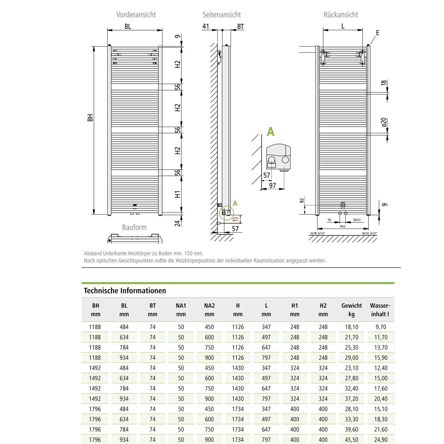 - Zusätzlich seitlich 2 x G 1/2“ IG nach unten, Nabenabstand baulängenabhängig, Vorlauf links oder rechts möglich