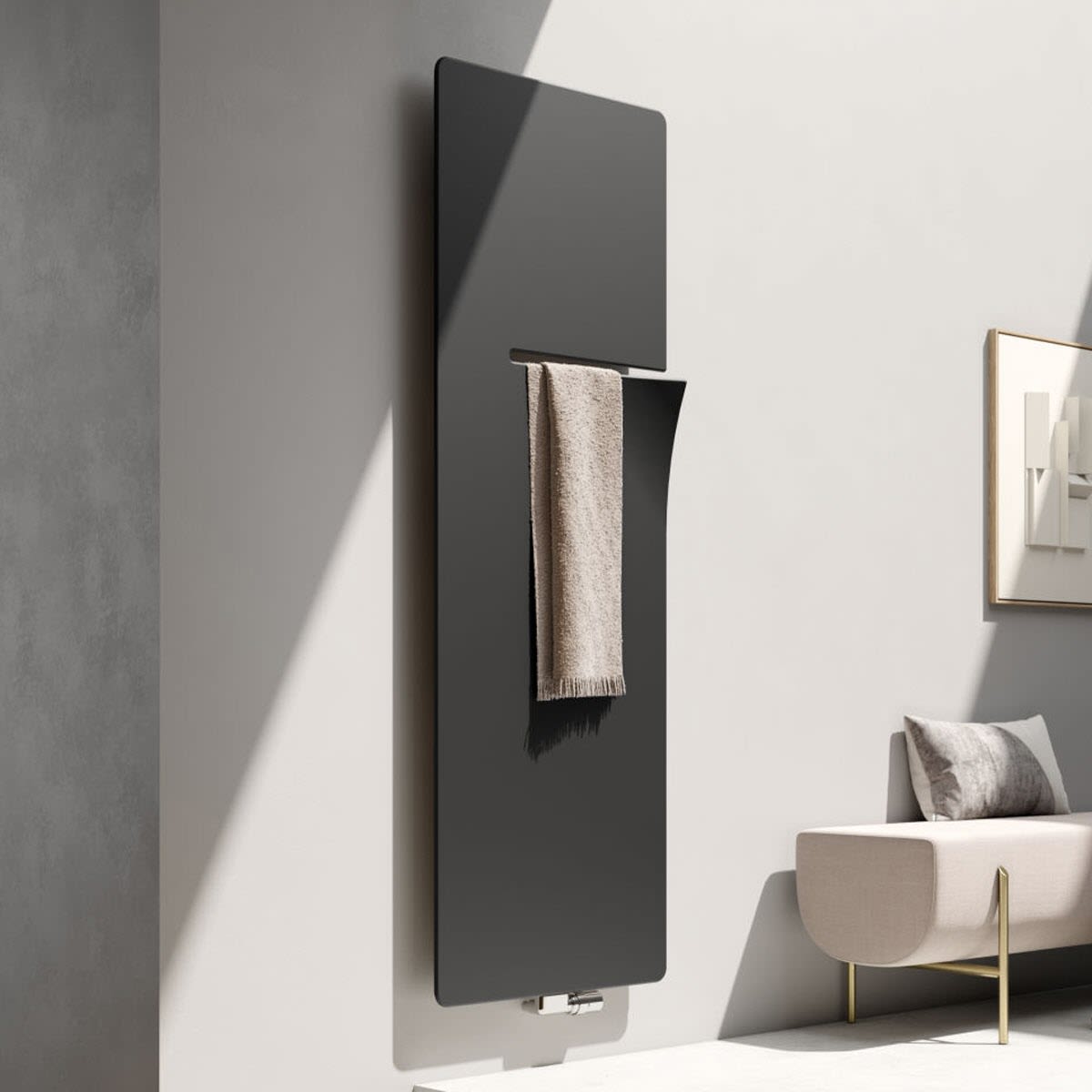 Der Bad- und Wohnheizkörper bringt das Besondere im Außergewöhnlichen zum Vorschein. Sein zeitlos flächiges Design wird durchbrochen von einer einzigartigen, seitlichen Aussparung. Sie ist gleichermaßen optisches Highlight und komfortables Detail zum bequemen Einfädeln und wieder Aufnehmen des Handtuchs - angenehm vorgewärmt und genau in bedienerfreundlicher Höhe.