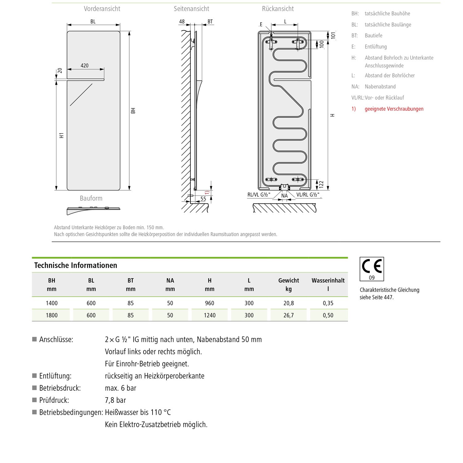 Abstand Unterkante Heizkörper zum Boden min. 15 cm.