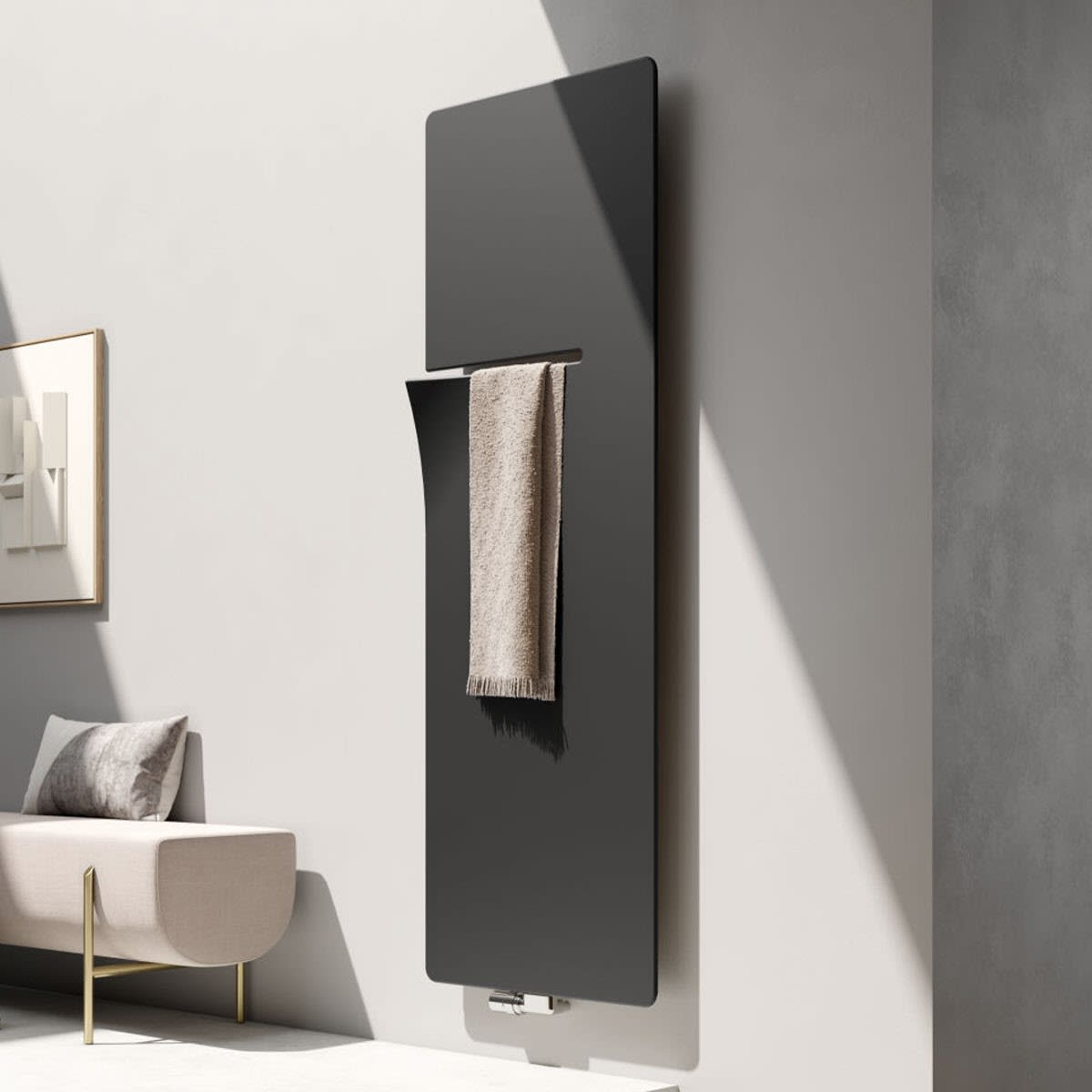 Der Bad- und Wohnheizkörper bringt das Besondere im Außergewöhnlichen zum Vorschein. Sein zeitlos flächiges Design wird durchbrochen von einer einzigartigen, seitlichen Aussparung. Sie ist gleichermaßen optisches Highlight und komfortables Detail zum bequemen Einfädeln und wieder Aufnehmen des Handtuchs - angenehm vorgewärmt und genau in bedienerfreundlicher Höhe.