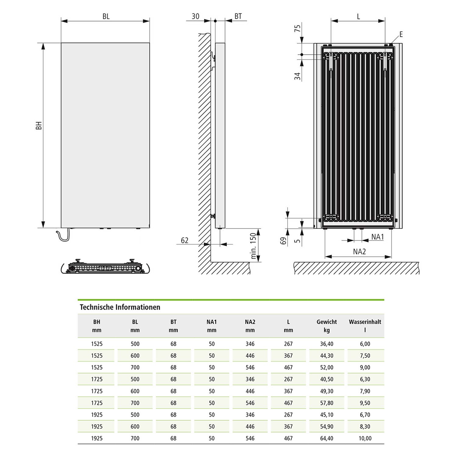 - inkl. auf System abgeglichenes Wandkonsolen-Montageset, Blind- und Entlüftungsstopfen, Befestigung in Heizkörperfarbe