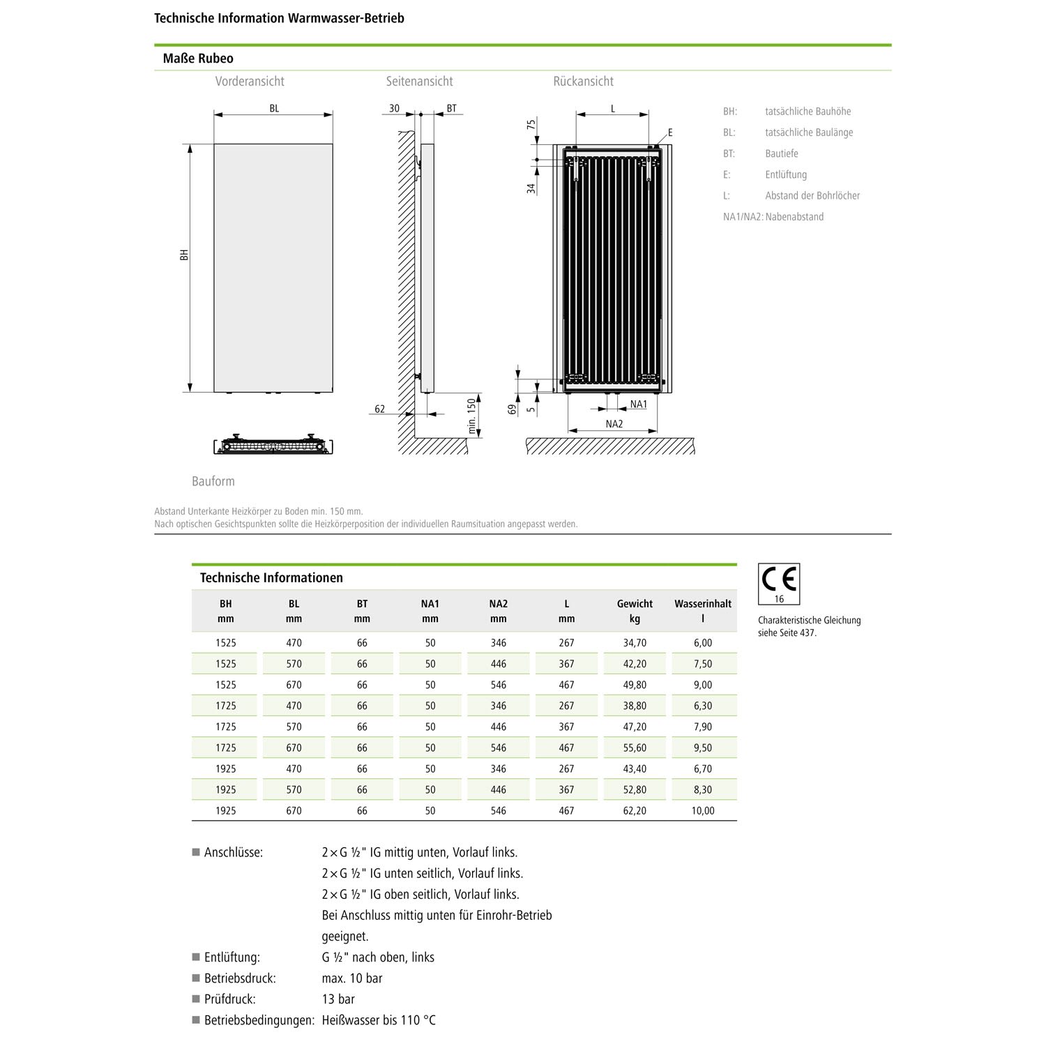 - bei Anschluss mittig unten für Einrohr-Betrieb geeignet