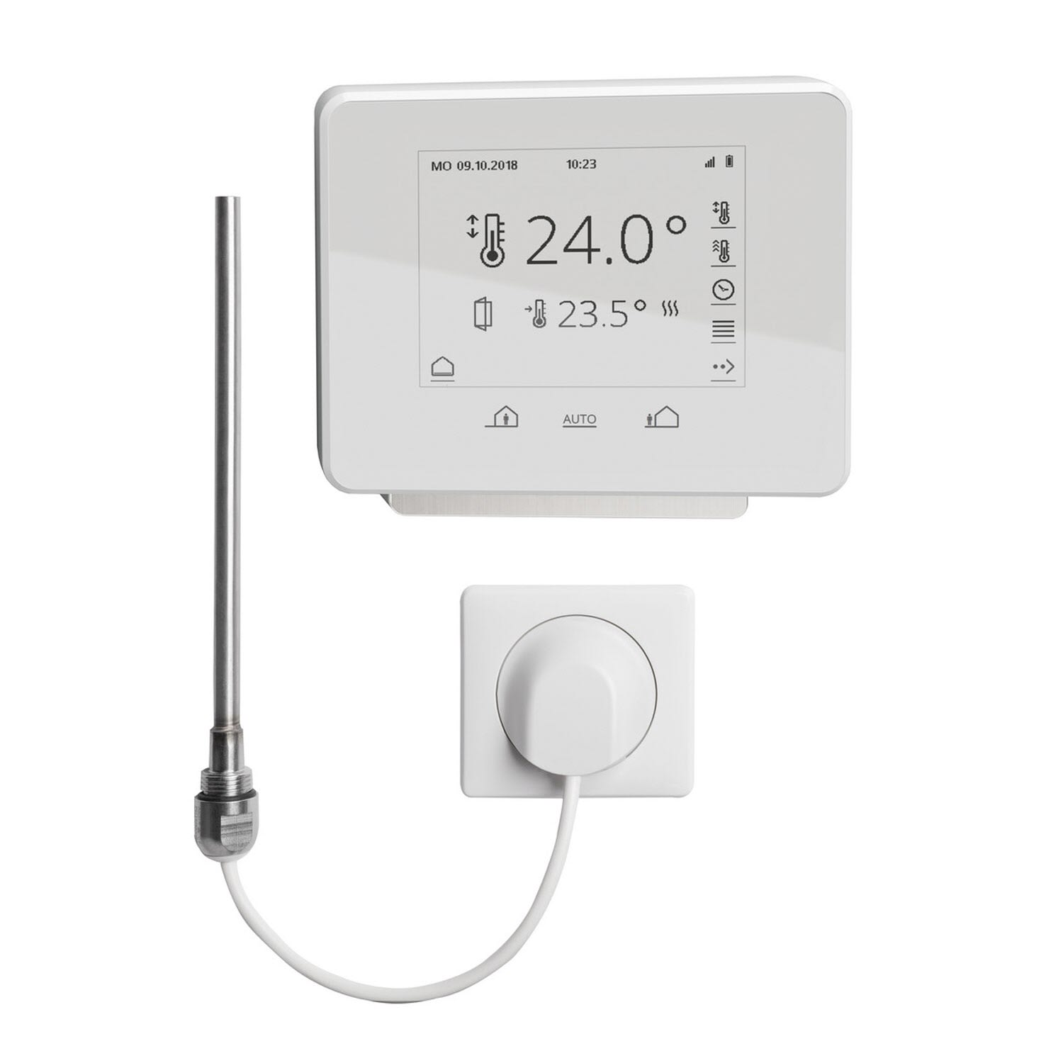 - besteht aus einem Wandauslass (Schutzart IPX4) inkl. Funkempfänger, einem elektronisch geregelten Heizstab und dem WRX Regler