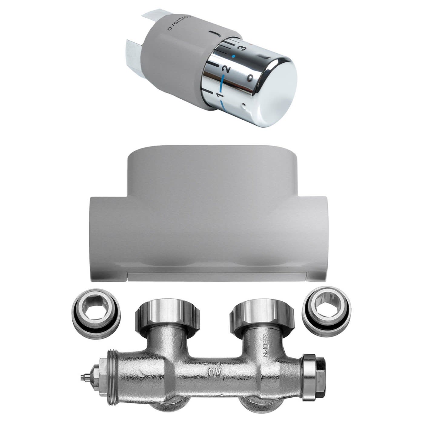 - Ventil einstellbar (Auslieferungszustand: für Zweirohrbetrieb, Ventil mit größter Voreinstellung, inkl. Baustellenkappe).
