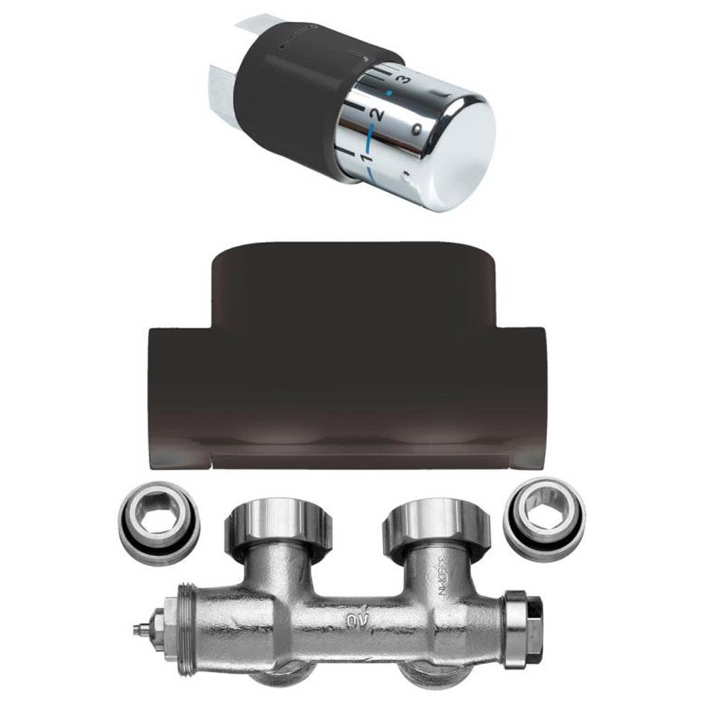 - 1 Verschraubung mit 50 mm Nabenabstand zwischen Heizkörper und Rohrleitungsnetz mit integriertem Ventil