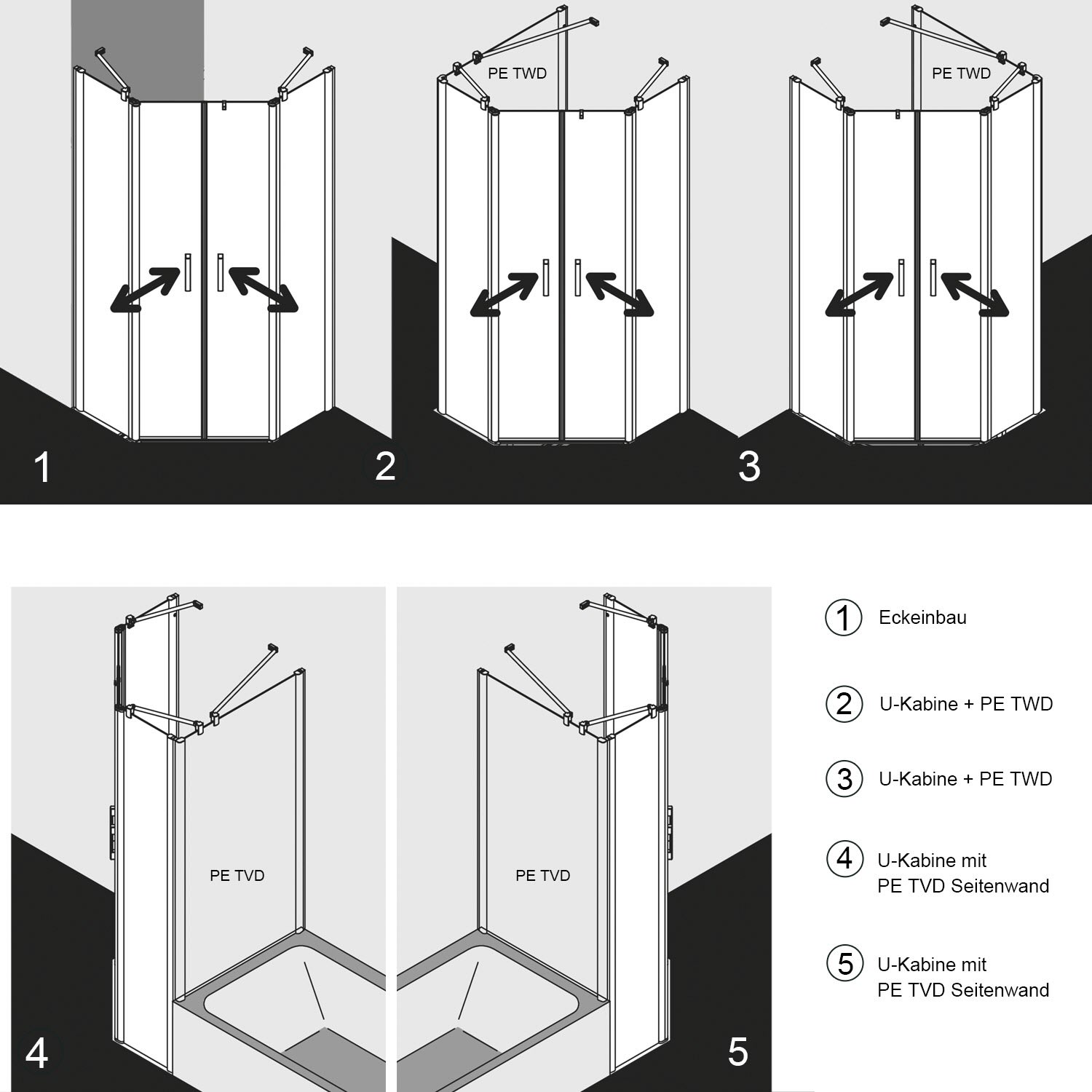 - bei Montage als U-Kabine bitte darauf achten, dass entsprechende Seitenwände separat bestellt werden müssen