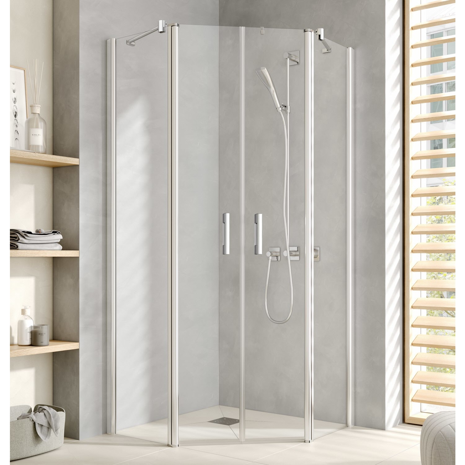 - Teilgerahmte Fünfeck-Duschkabine mit zwei Glasflügeln, nach innen und außen öffnend, mit zwei Festfeldern