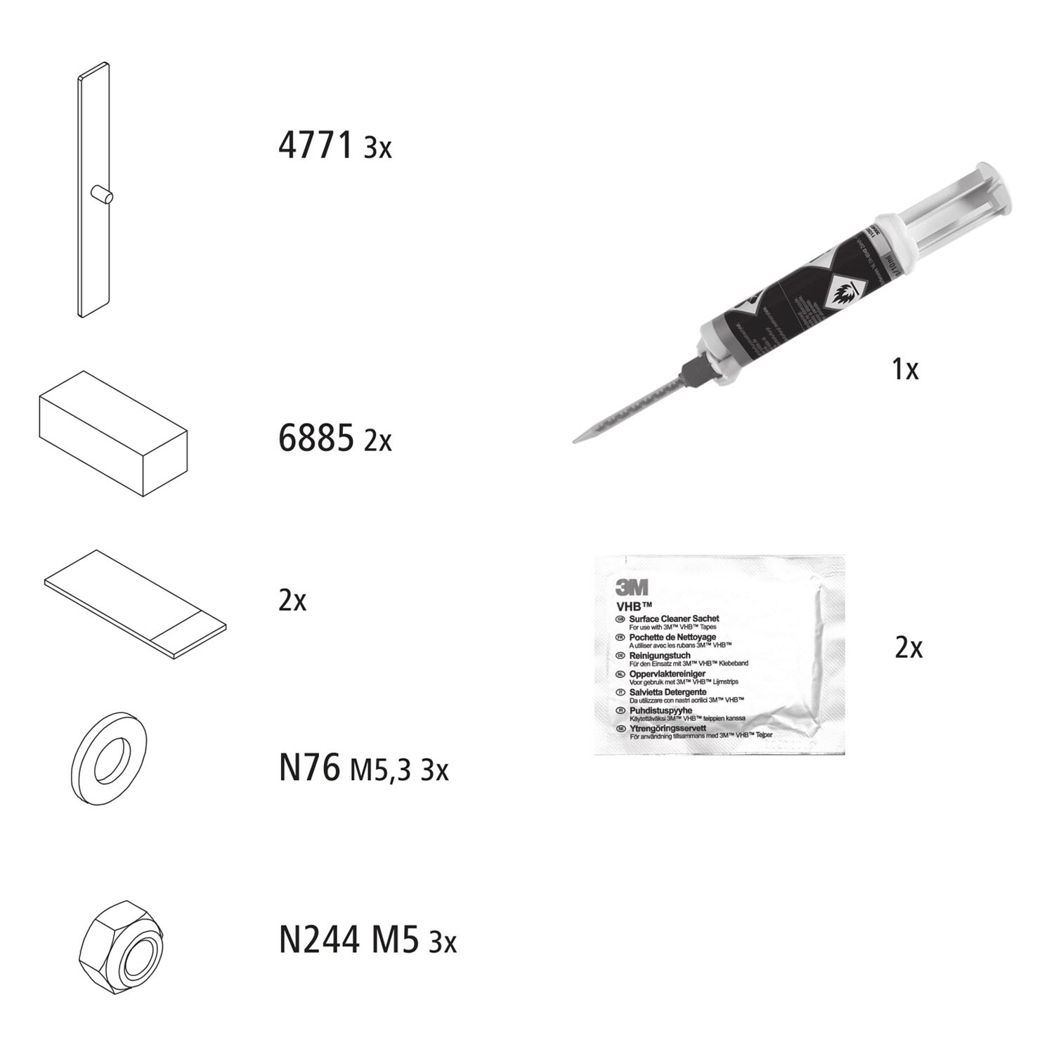 - bestehend aus 3 Montageplatten, Klebstoff und Montagekleinteilen